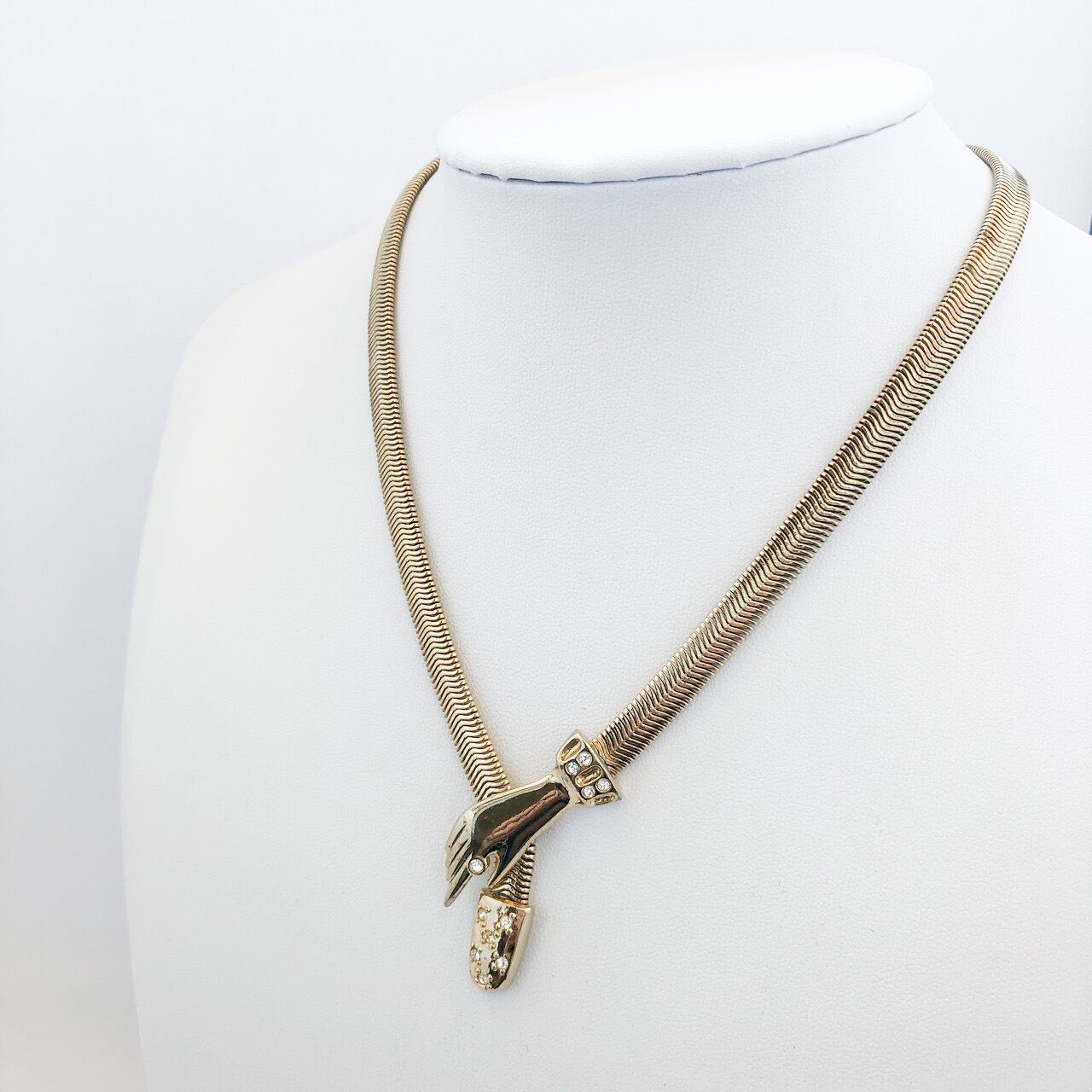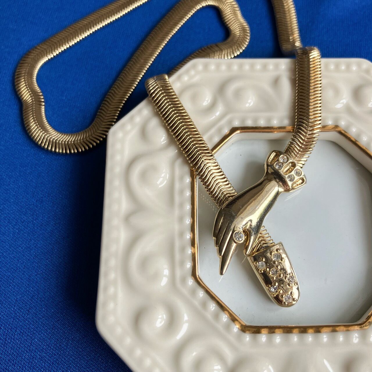 落ち着いたゴールドメタルの手がチェーンを掴んだようなデザインが、とても素敵なヴィンテージネックレスです。