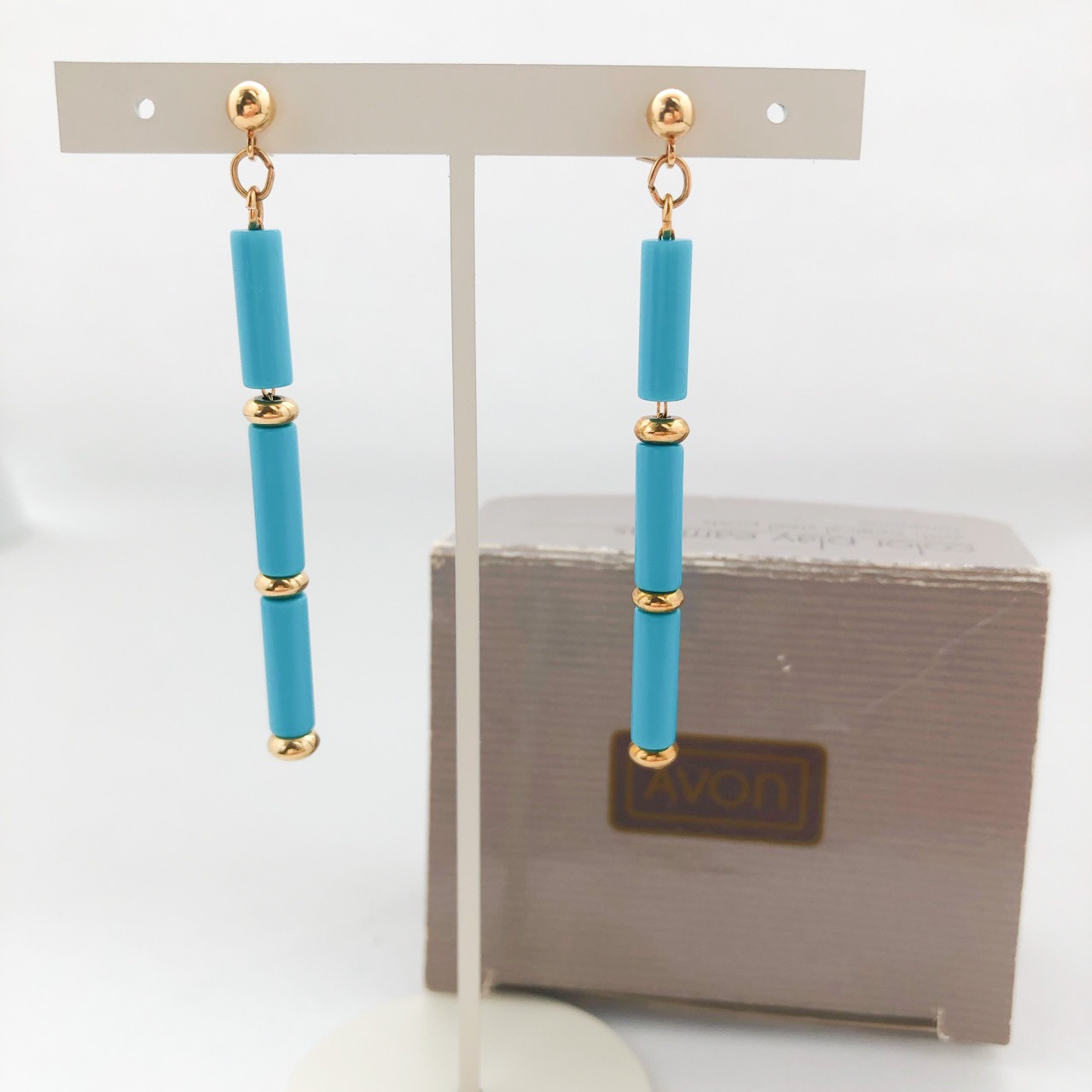 きれいな縦長のターコイズビーズとゴールドビーズが揺れるデザインが、とても素敵な”AVON”(エイボン)のヴィンテージピアスです。