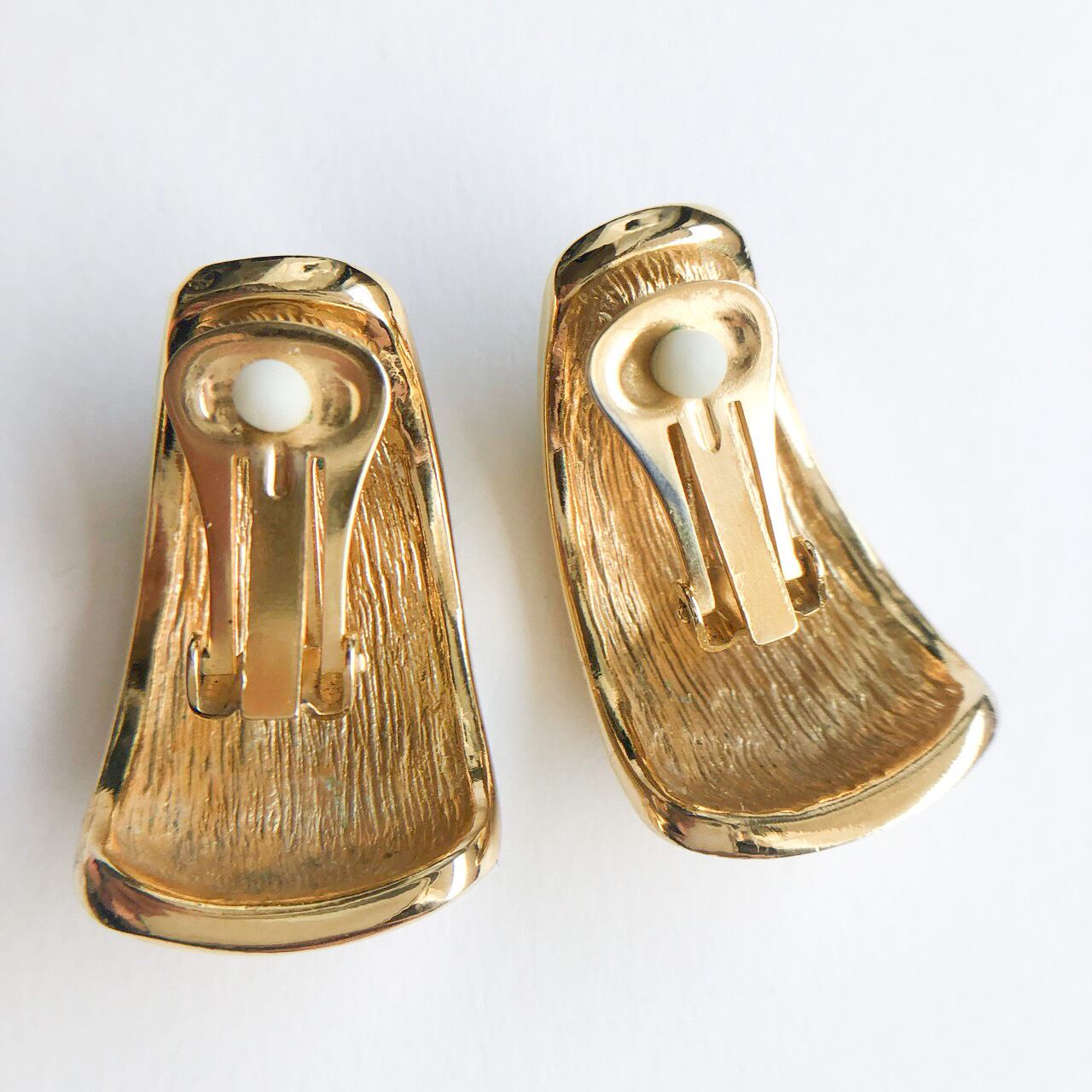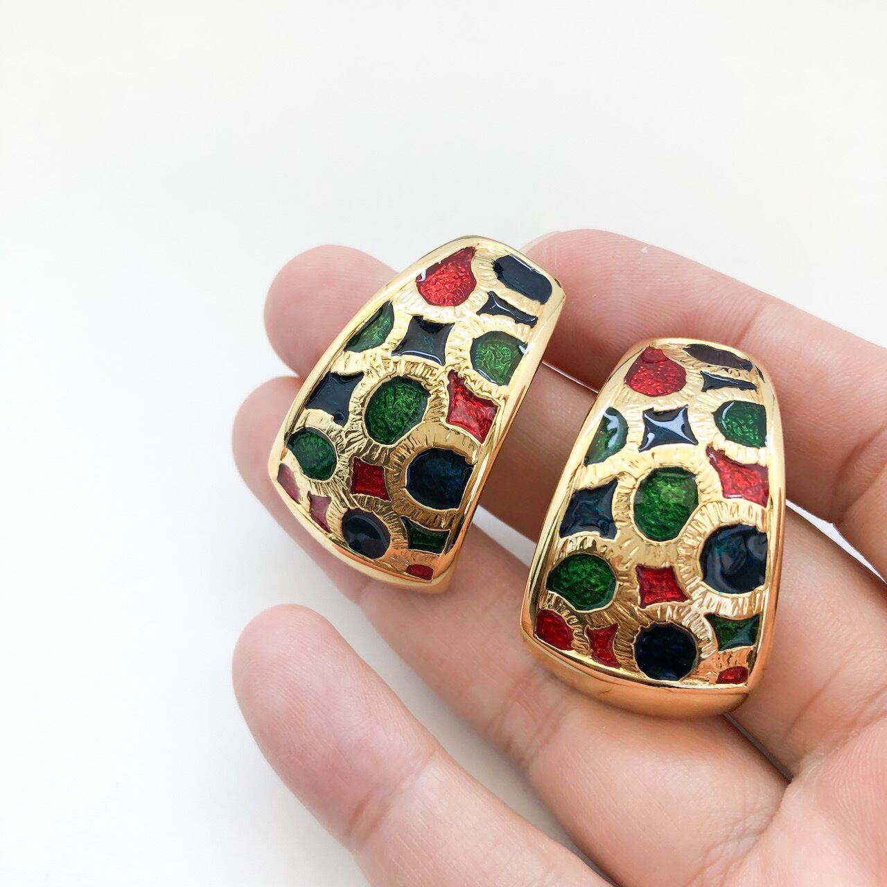 加工されたゴールドメタルの土台に、レッド、ブルー、グリーンエナメルでカラフルにデザインされた、とても素敵なヴィンテージイヤリングです。