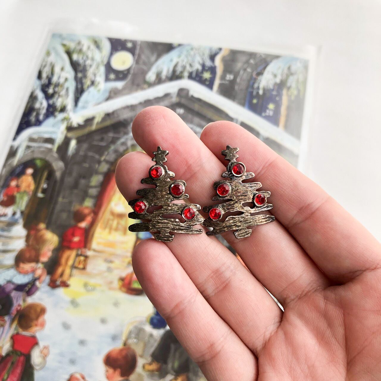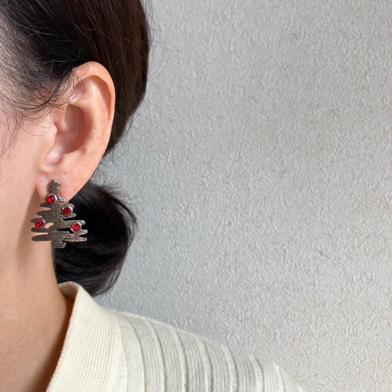渋い味のあるメタルに、レッドラインストーンがアクセントになったクリスマスツリーのデザインが、とても素敵なヴィンテージピアスです。
