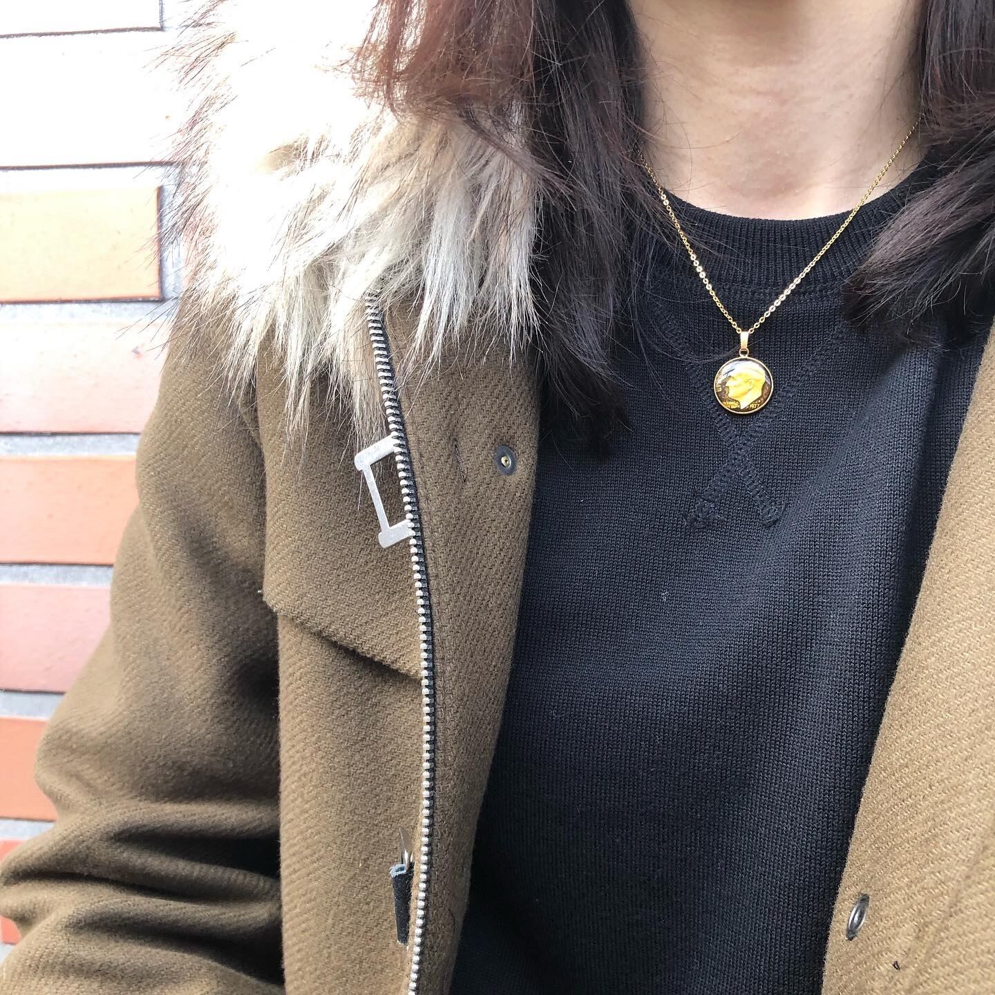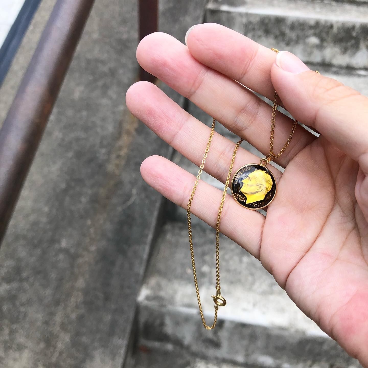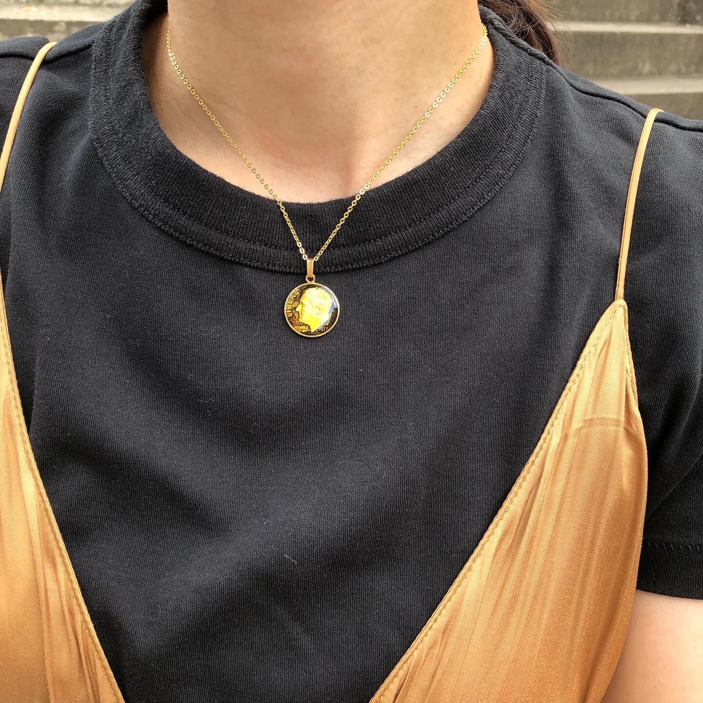 ゴールドメタルのUSAコインの上に黒っぽく樹脂加工され、身につけたときに温度で色が微妙に変わるユニークなヴィンテージネックレスです。