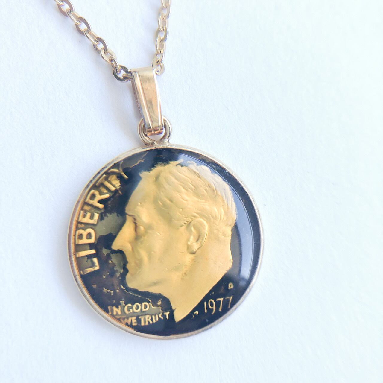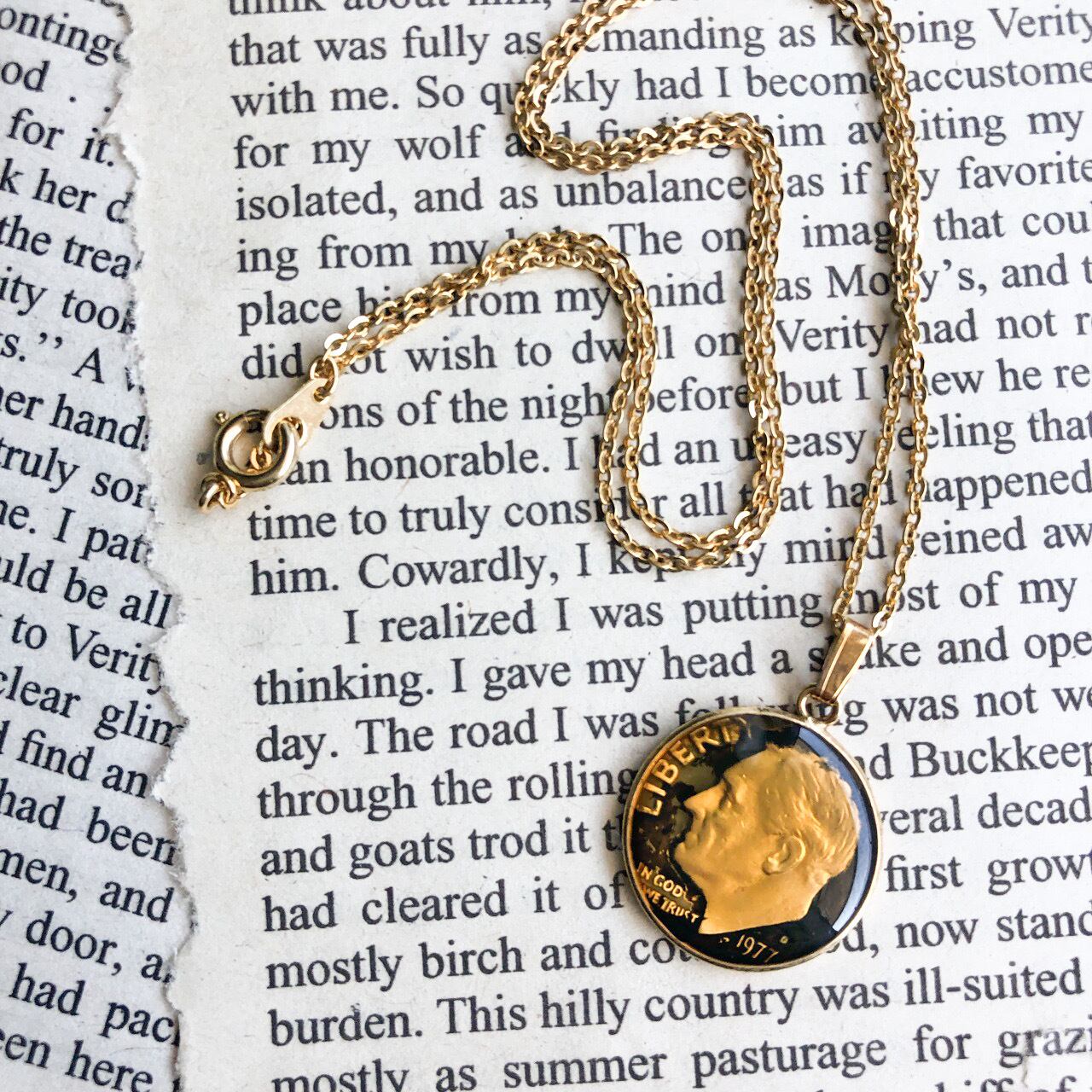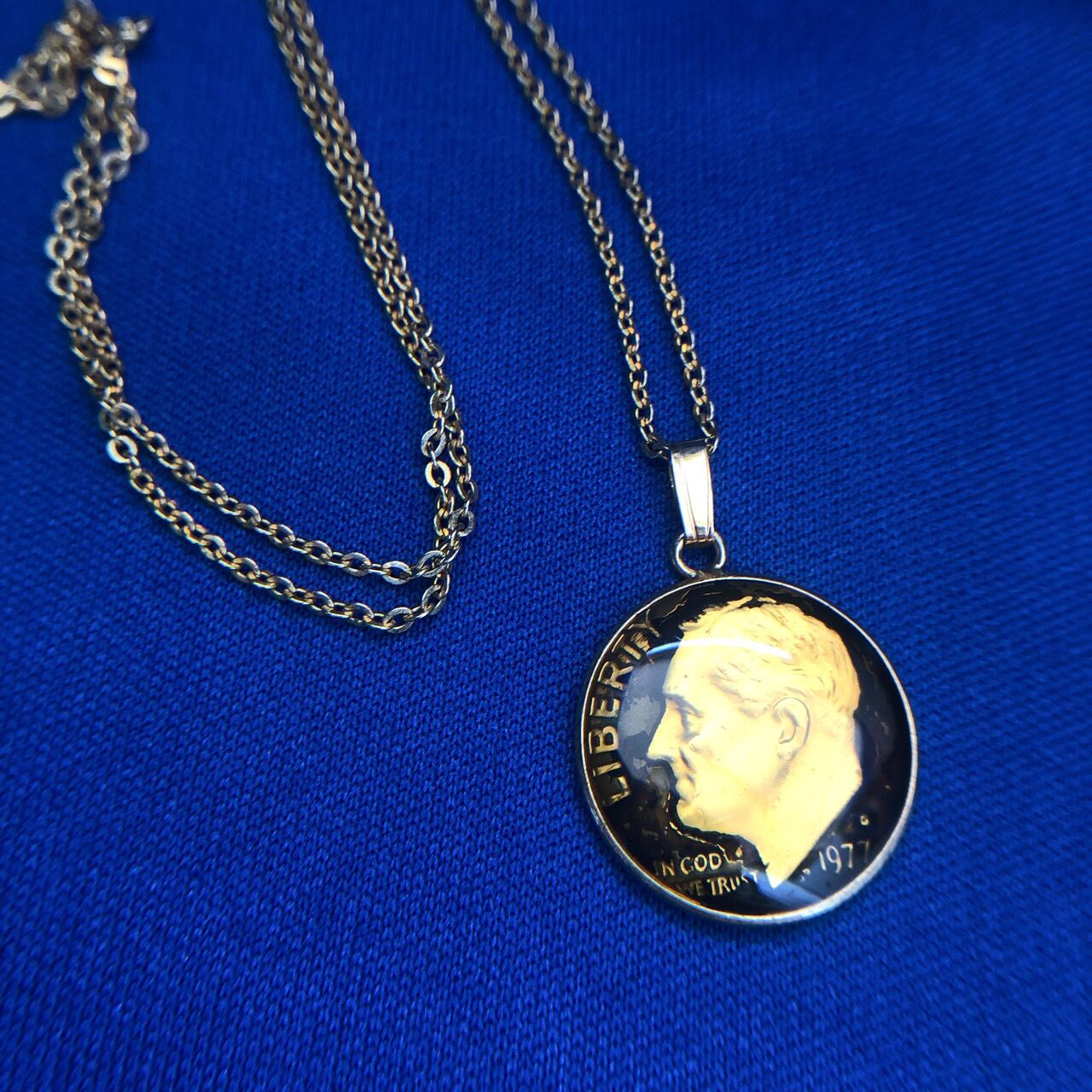 ゴールドメタルのUSAコインの上に黒っぽく樹脂加工され、身につけたときに温度で色が微妙に変わるユニークなヴィンテージネックレスです。