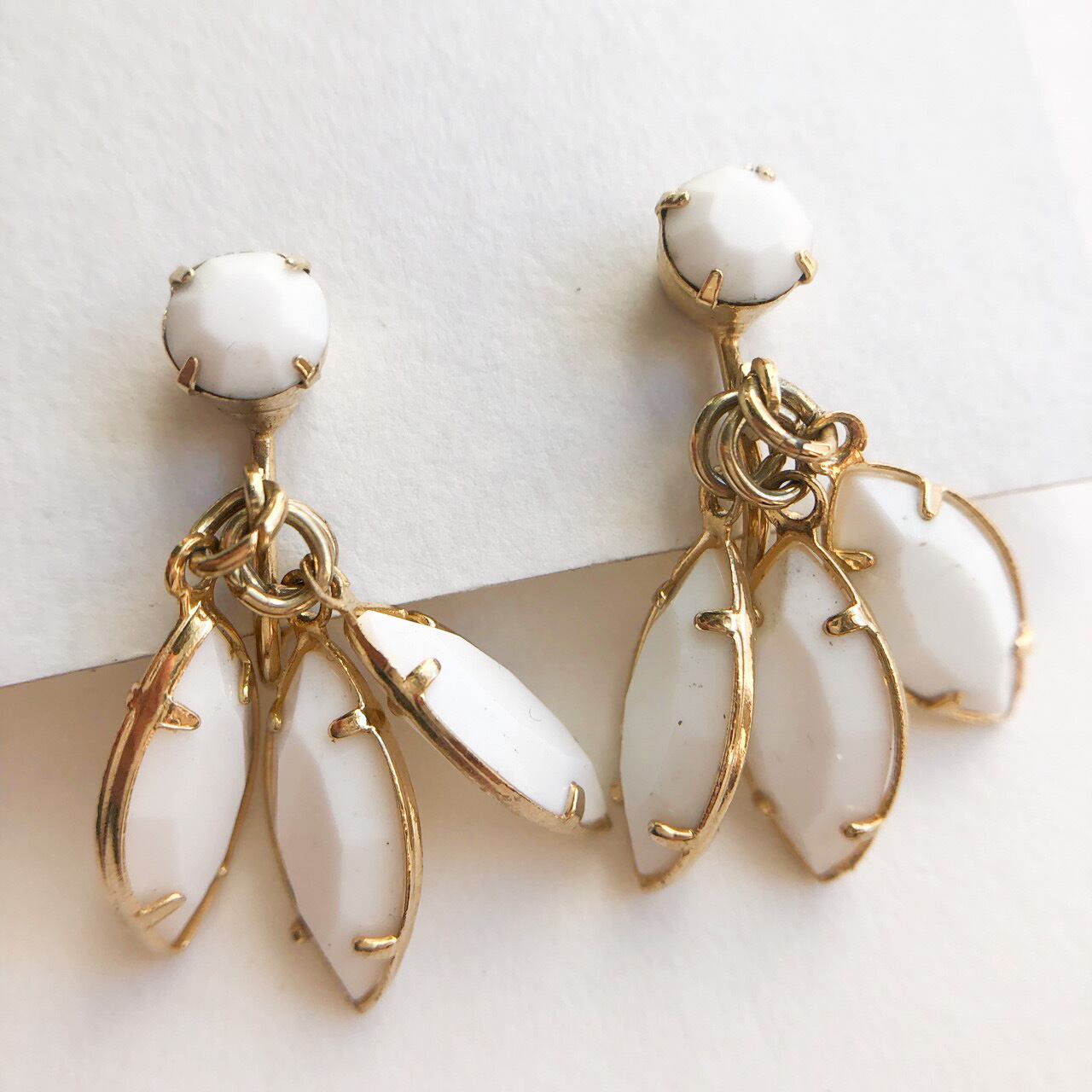 ゴールドメタルの土台にカットが美しい3つのホワイトプラスティックパーツが揺れる、とても素敵なヴィンテージイヤリングです。