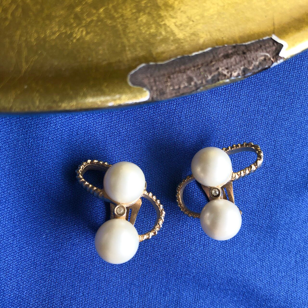 ゴールドメタルのモダンなデザインの土台に、マット感のあるパールビーズとラインストーンでお洒落にデザインされた、とても素敵なヴィンテージイヤリングです。