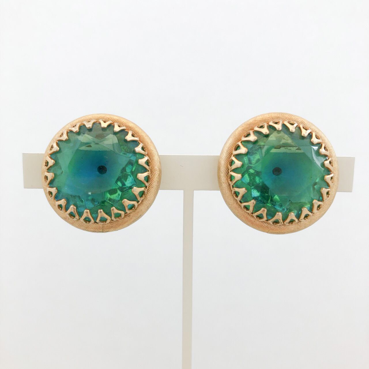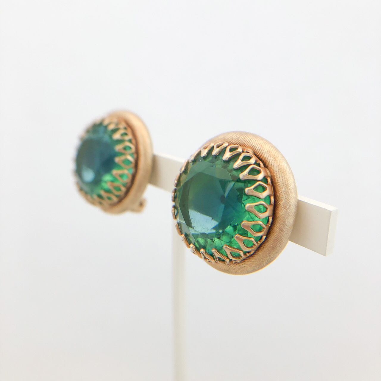ゴールドメタルのラウンド型の爪のある土台に、大粒のグリーンラインストーンがセットされた、とても素敵なヴィンテージイヤリングです。