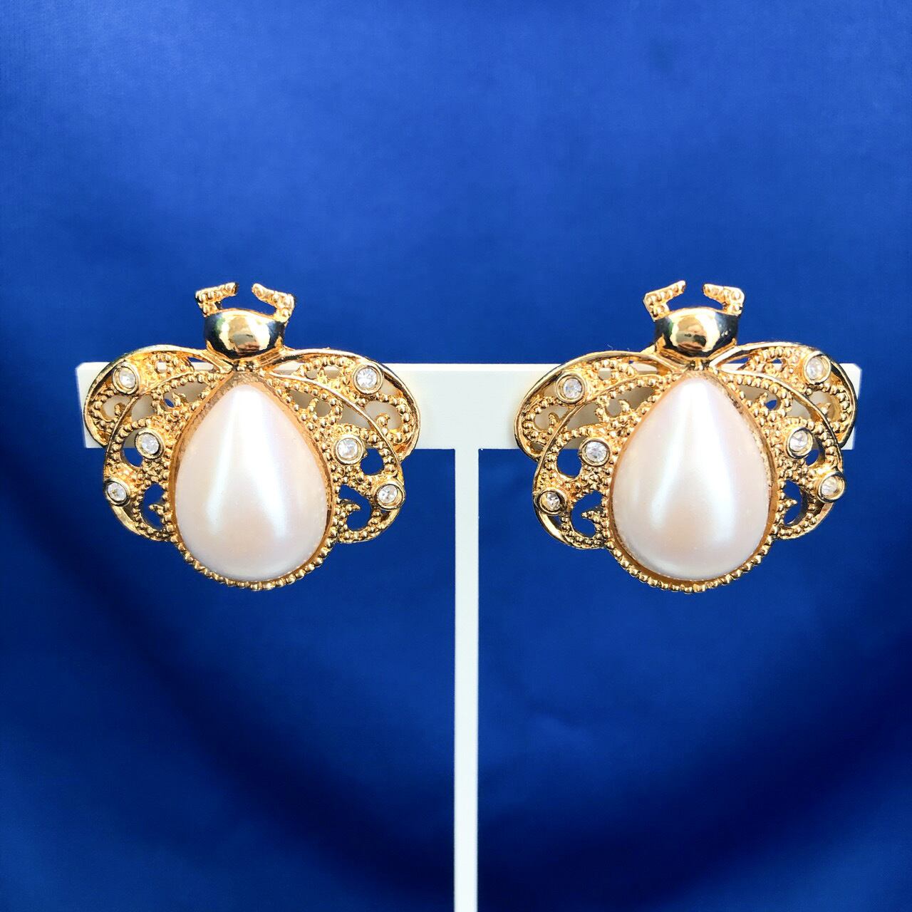 ゴールドメタルにドロップパールカボションと小粒のラインストーンのユニークな虫のデザインが、とても素敵な”AVON”(エイボン)のヴィンテージイヤリングです。