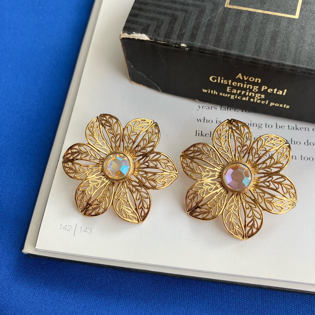 落ち着いた色合いのゴールドメタルの透かし柄の大きなお花に大粒のオーロララインストーンがセットされた、華やかで存在感のあるデザインがとても素敵な、”AVON”(エイボン)のヴィンテージピアスです。