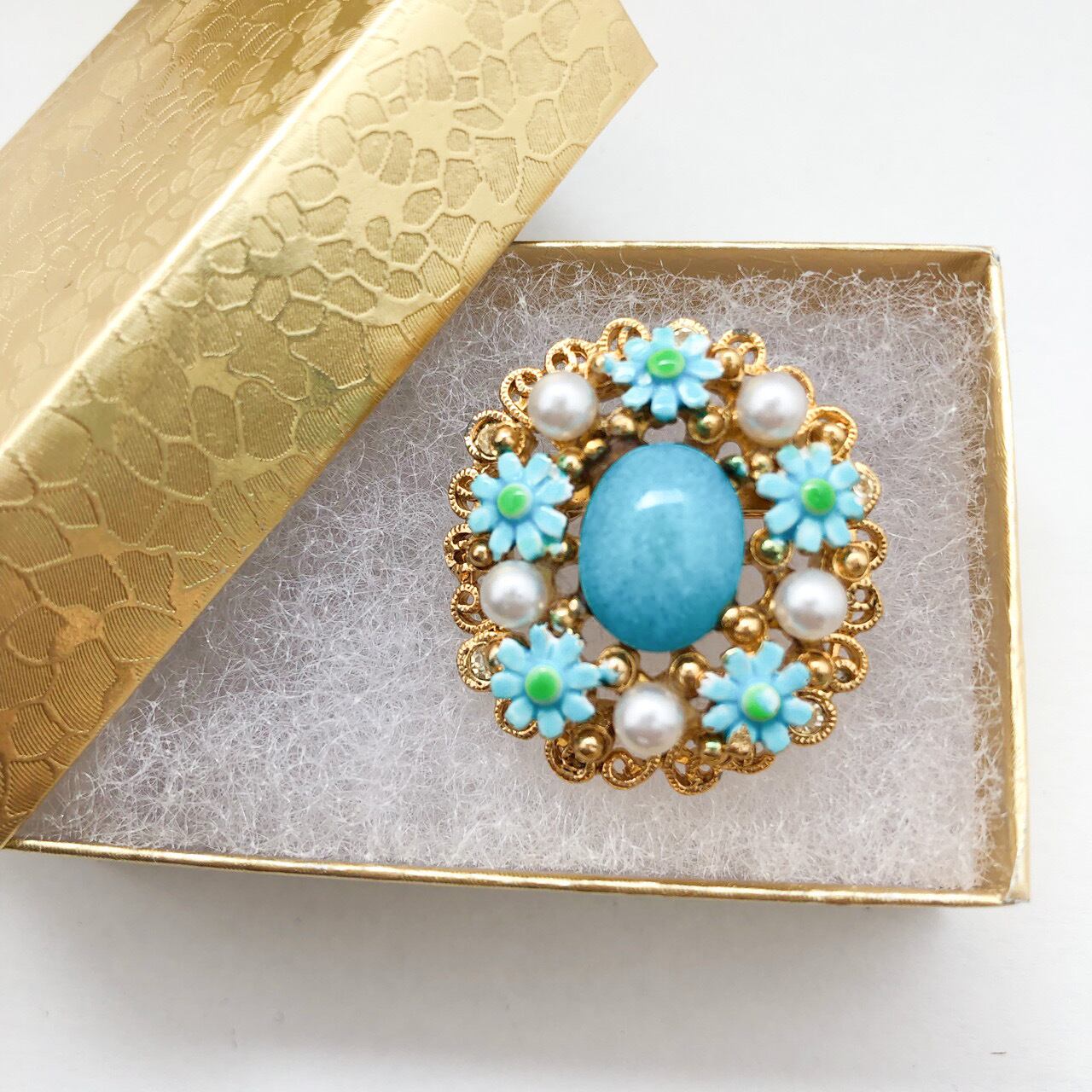 ゴールドメタルの装飾的な土台に、ターコイズブルーカボションやフラワー、パールビーズでデザインされた、とても素敵なヴィンテージブローチです。