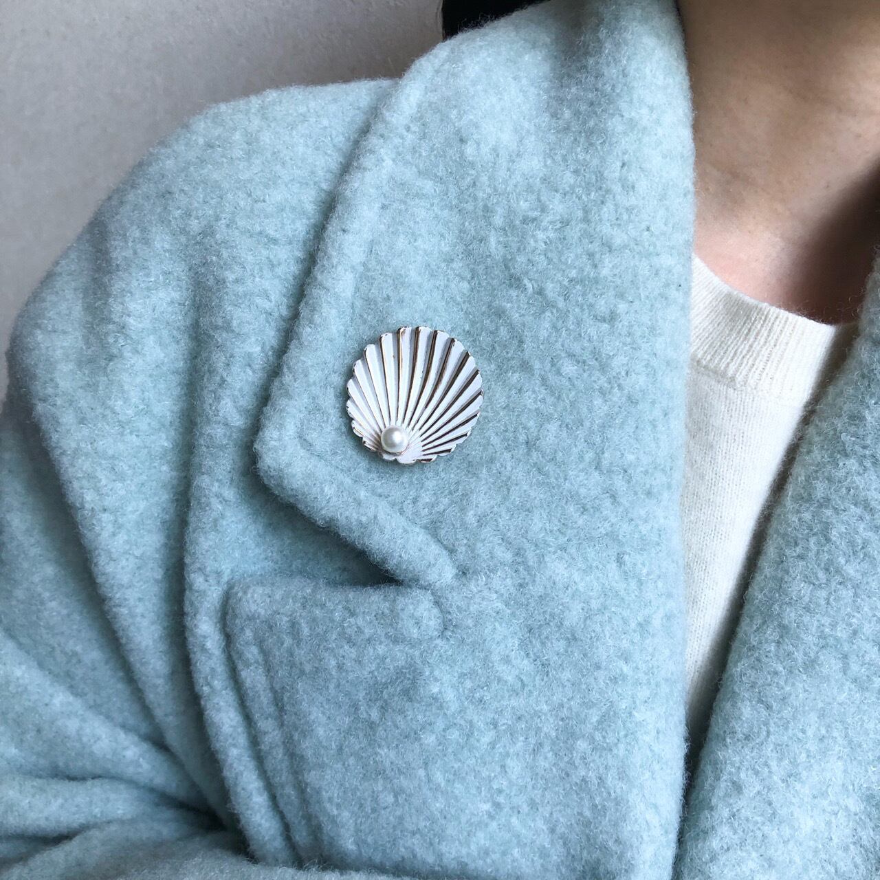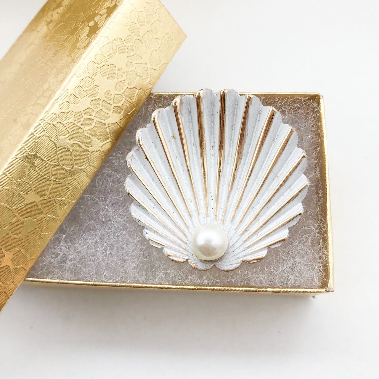 ゴールドメタルの土台に、全体のホワイトペイントとパールビーズでシェルがデザインされた、とても素敵なヴィンテージブローチです。