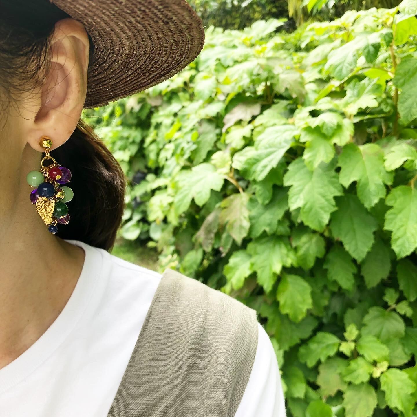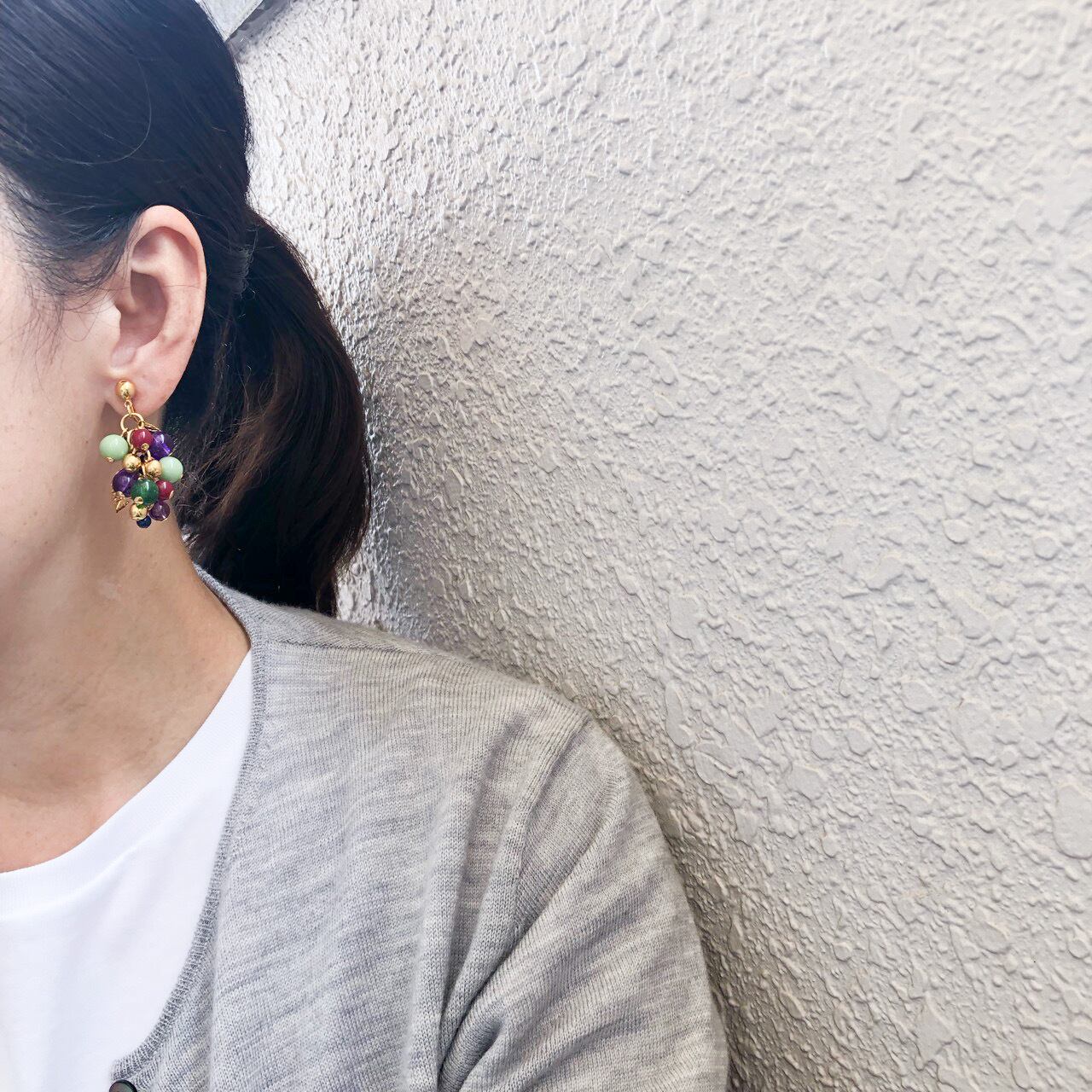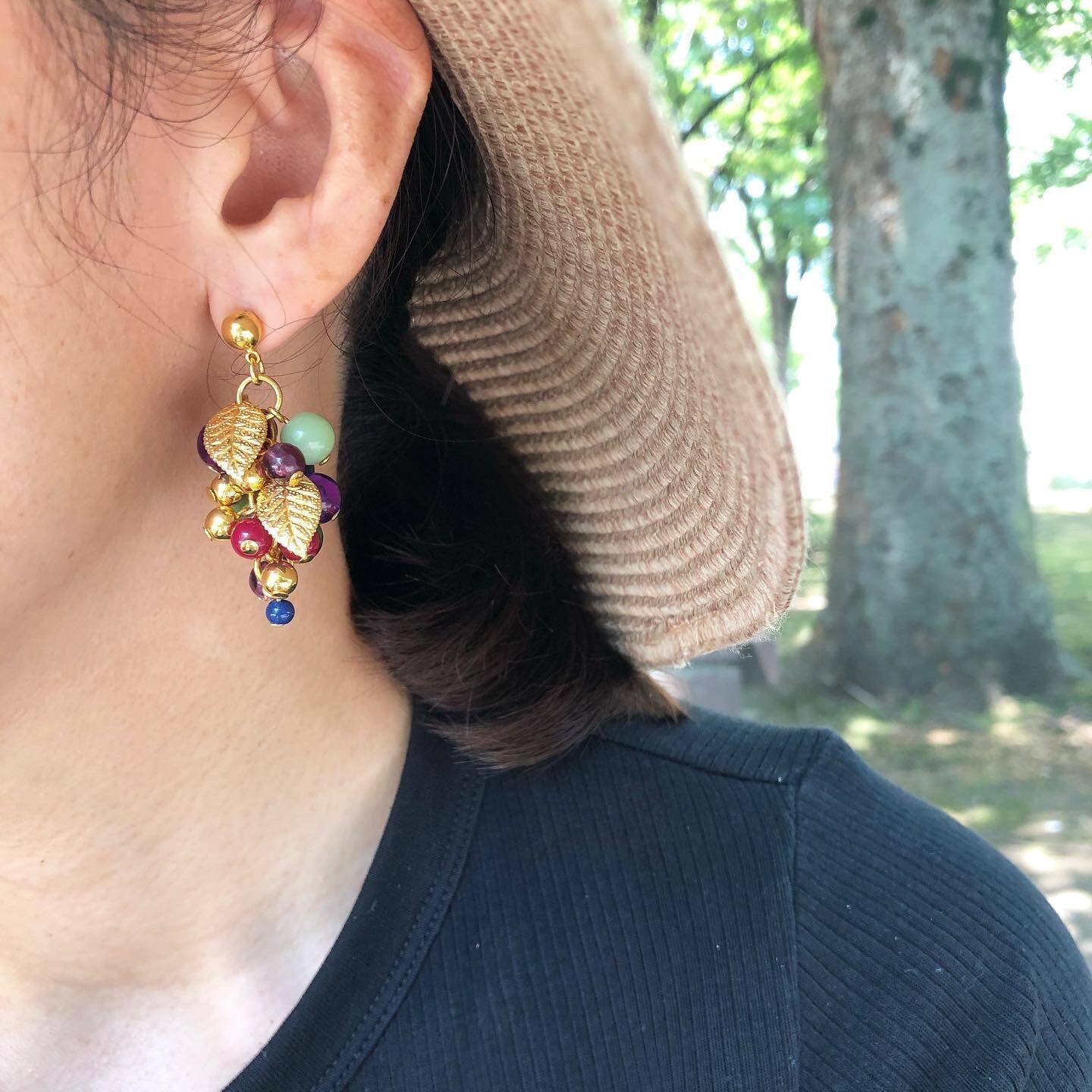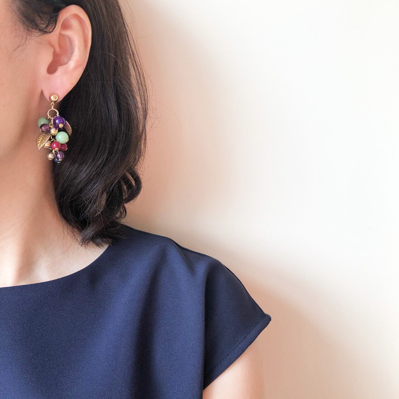パープルやグリーンなど落ち着いたカラーのビーズがブドウの房になって揺れるデザインが、とても素敵な”AVON”(エイボン)のヴィンテージイヤリングです。