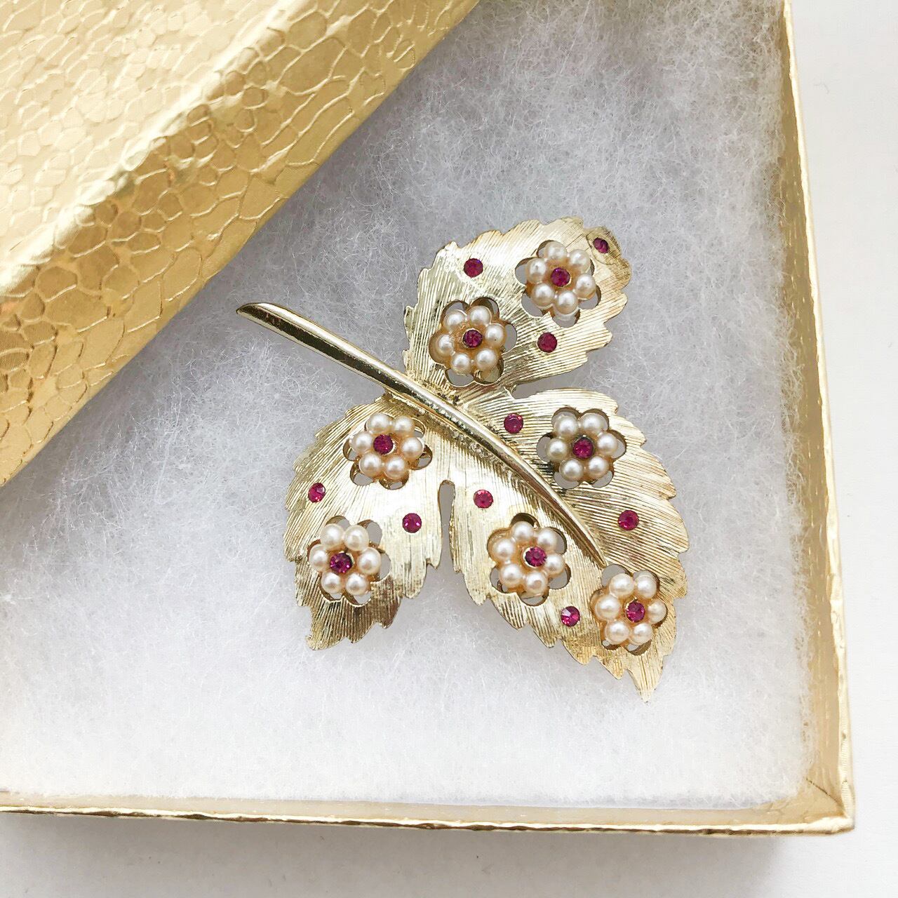 pearl & pink rhinestone leaf brooch[b-350] ヴィンテージブローチ