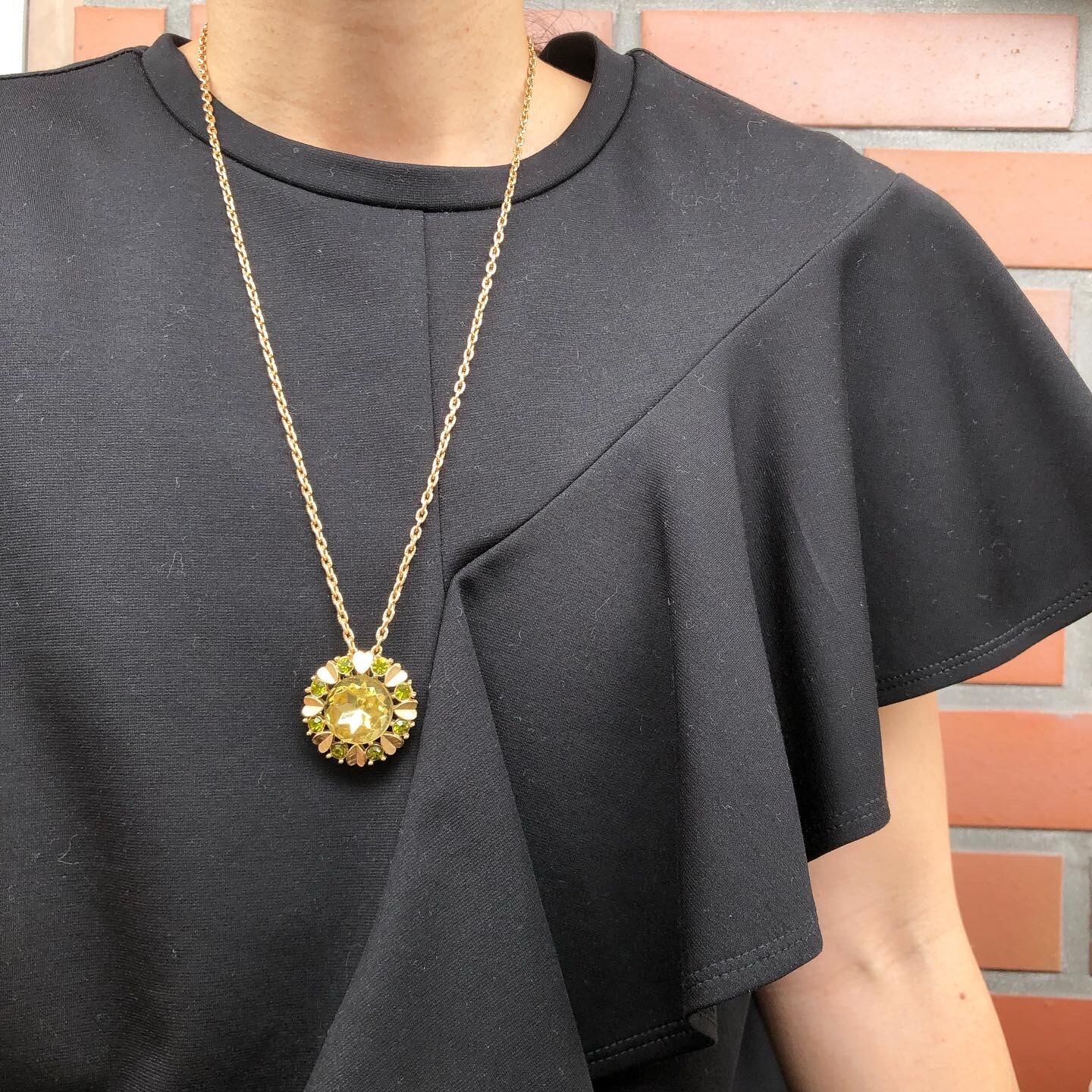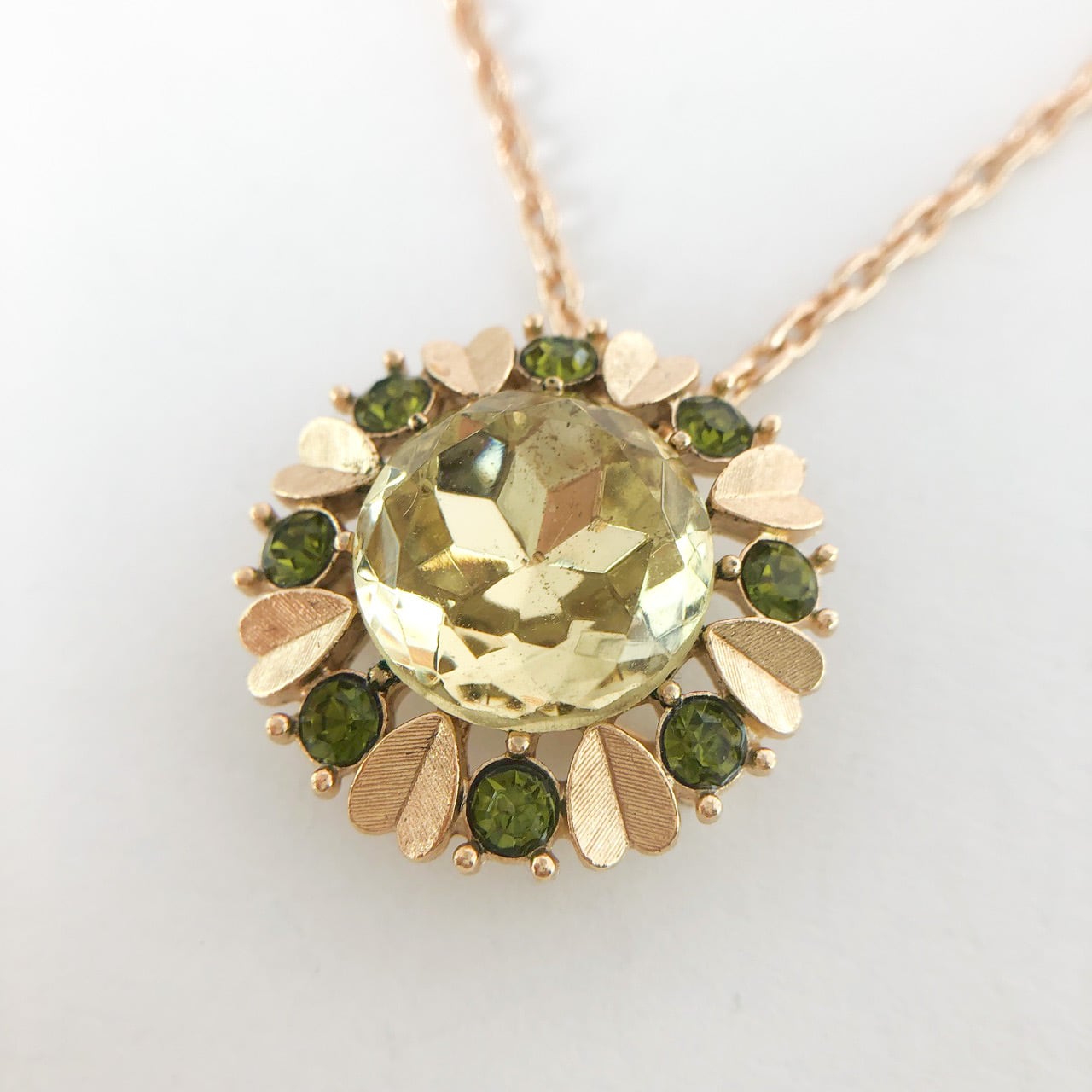 ゴールドメタルとグリーン系ラインストーンのお花のようなデザインが、とても素敵な”AVON”(エイボン)のヴィンテージネックレスです。