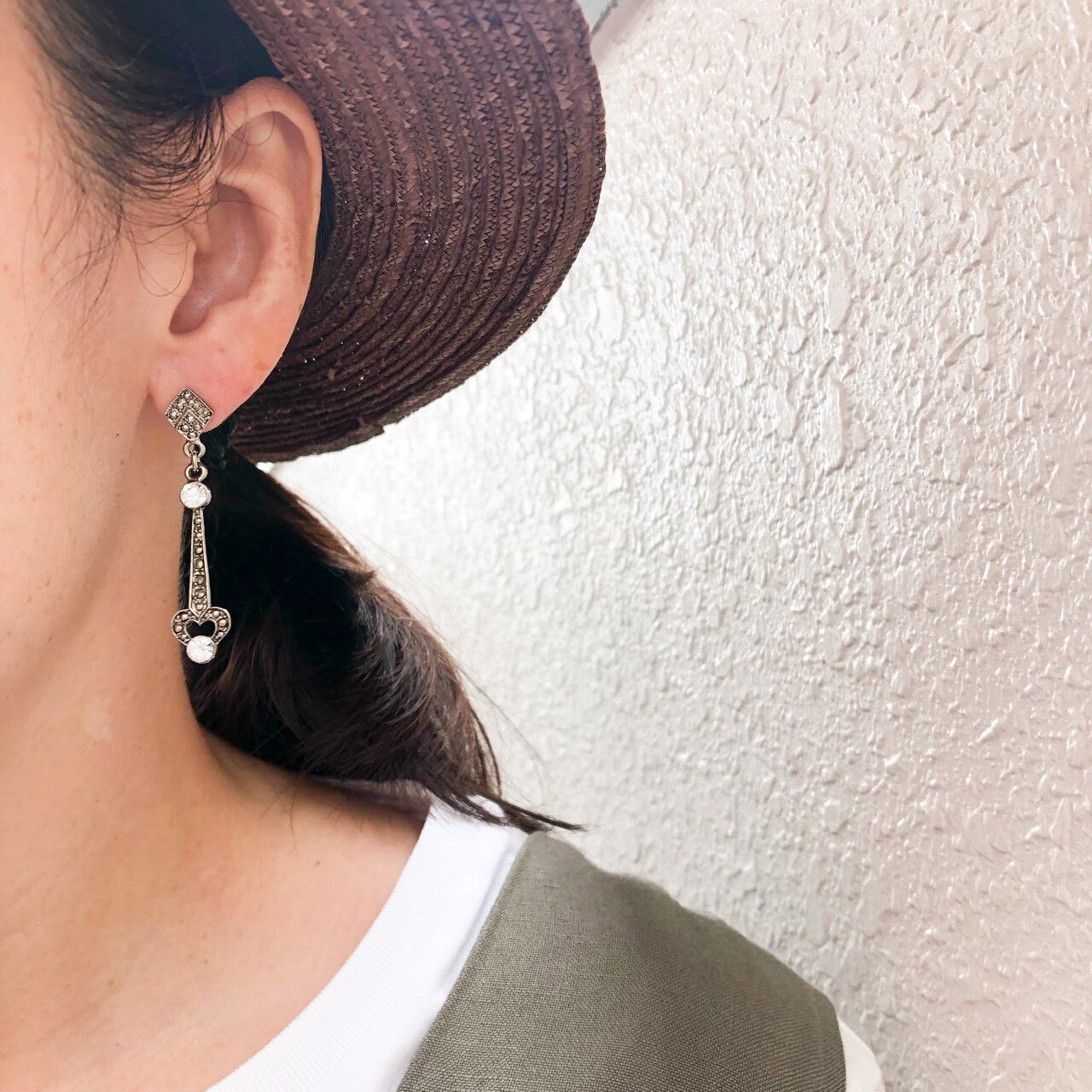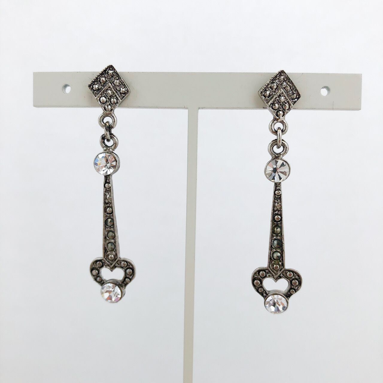 落ち着いたシルバーメタルに、マーカサイト風パーツとクリアラインストーンでクラシカルにデザインされた、とても素敵なヴィンテージピアスです。