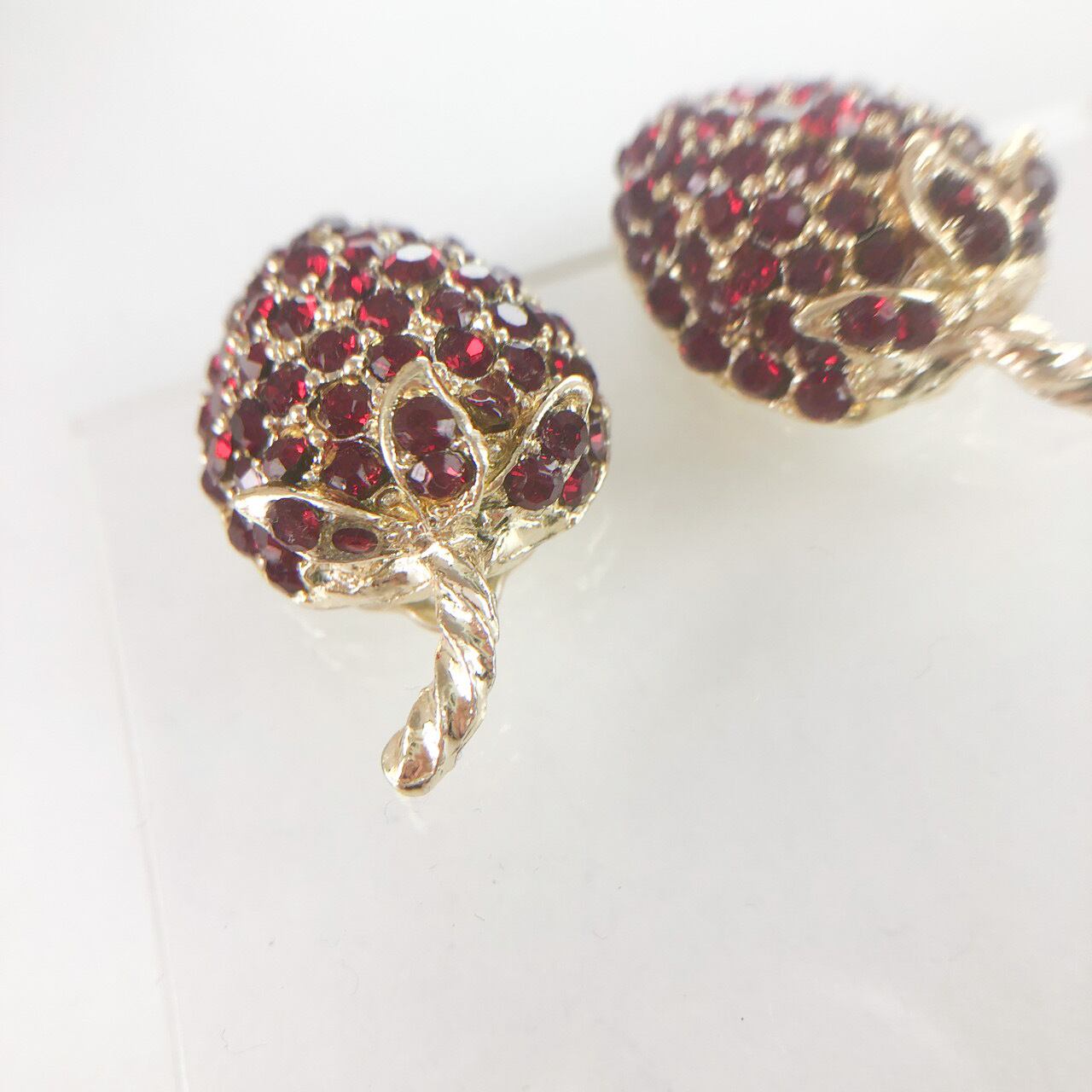 明るいゴールドメタルの土台に、小粒の落ち着いた赤のラインストーンで飾られたイチゴのデザインが、とても素敵なヴィンテージイヤリングです。
