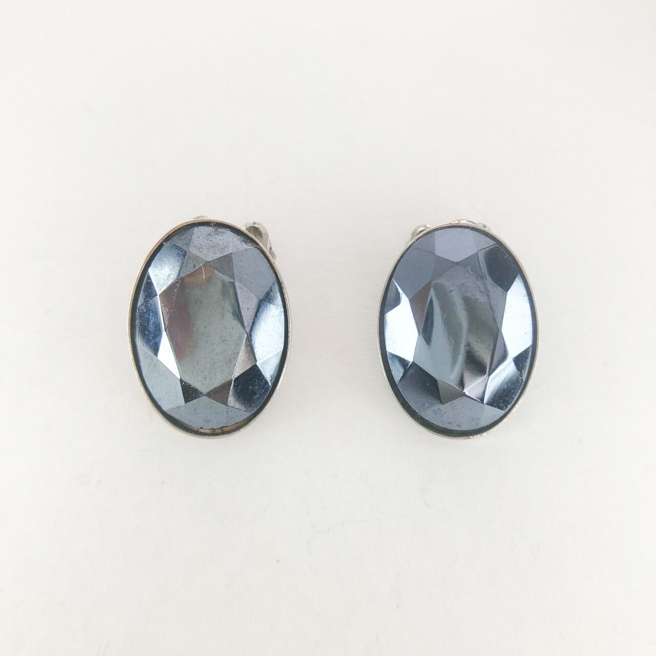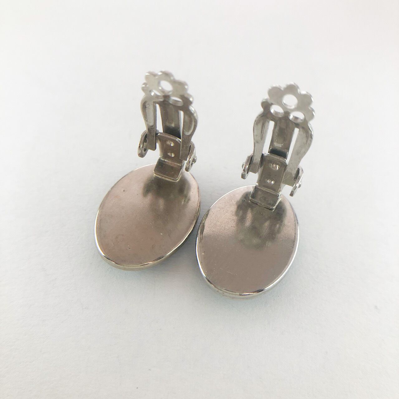 シルバーメタルの土台に、ブラック、グレー系メタルの色合いのカボションがセットされたデザインが、とても素敵なヴィンテージイヤリングです。