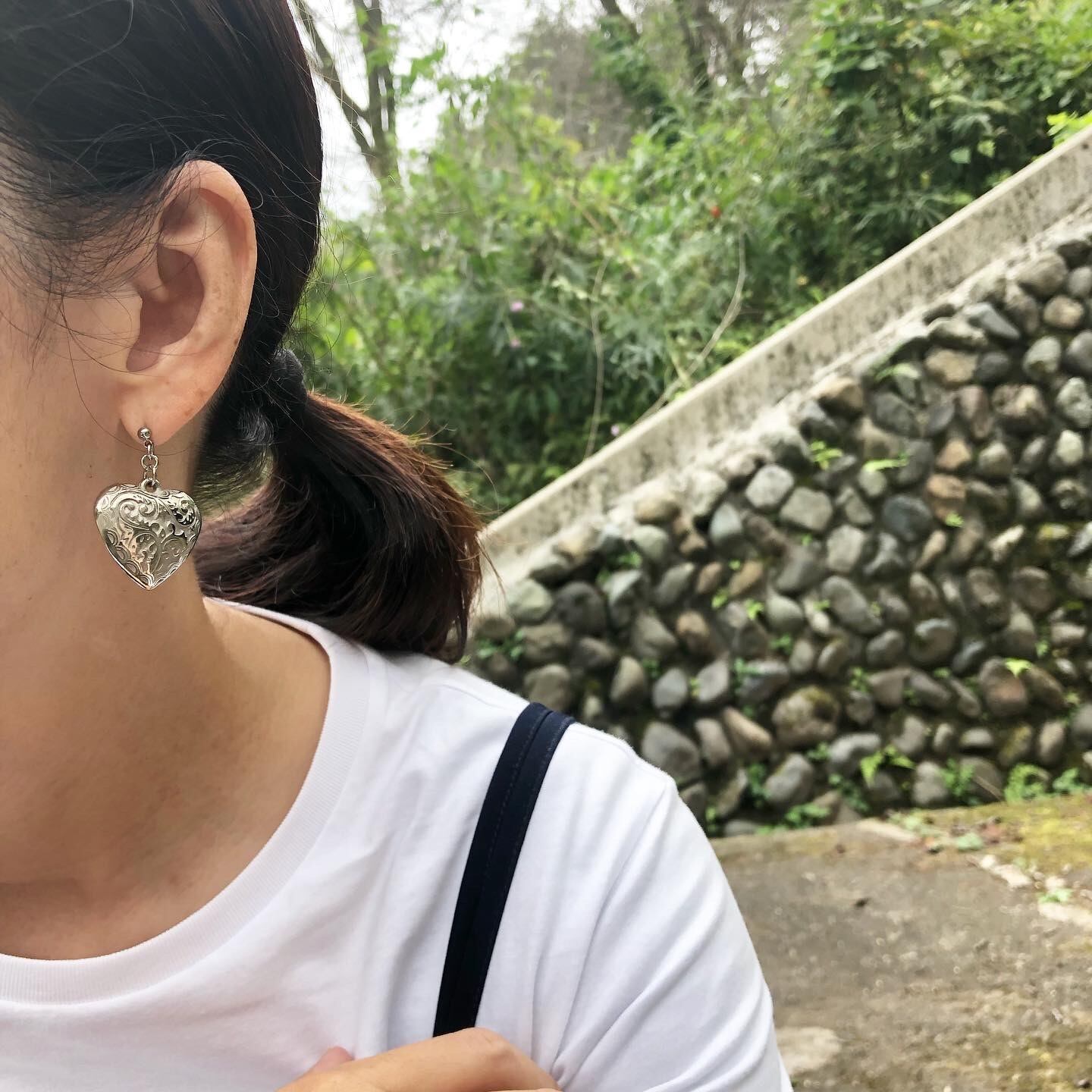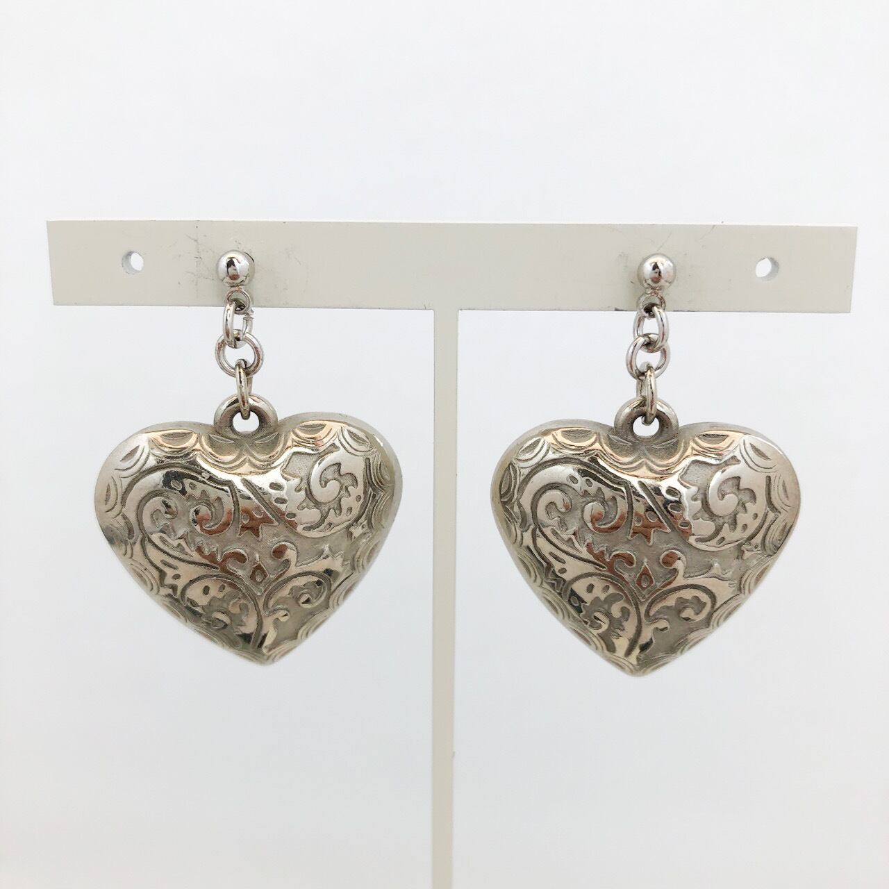 装飾的な彫り柄が入ったシルバーメタルの立体的なハートが揺れるデザインが、とても素敵なヴィンテージピアスです。