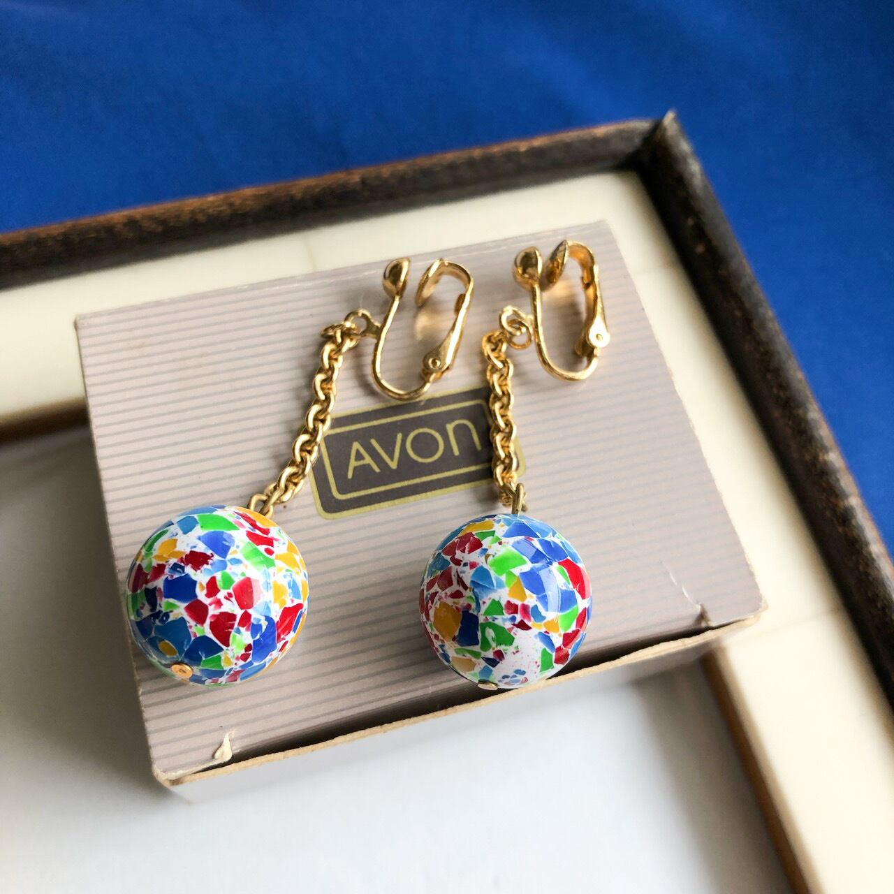 カラフルなモザイクデザインのボールがチェーンで揺れる、とても素敵な”AVON”(エイボン)のヴィンテージイヤリングです。