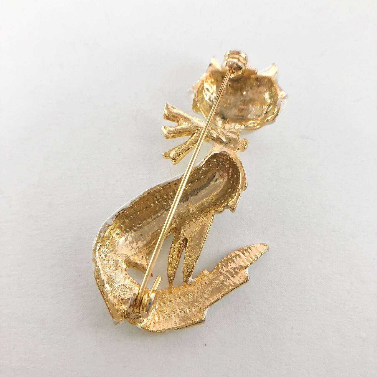 ホワイト(ややクリーム寄り)エナメルとゴールドメタル、ラインストーンでデザインされたお洒落な猫が、とても素敵なヴィンテージブローチです。