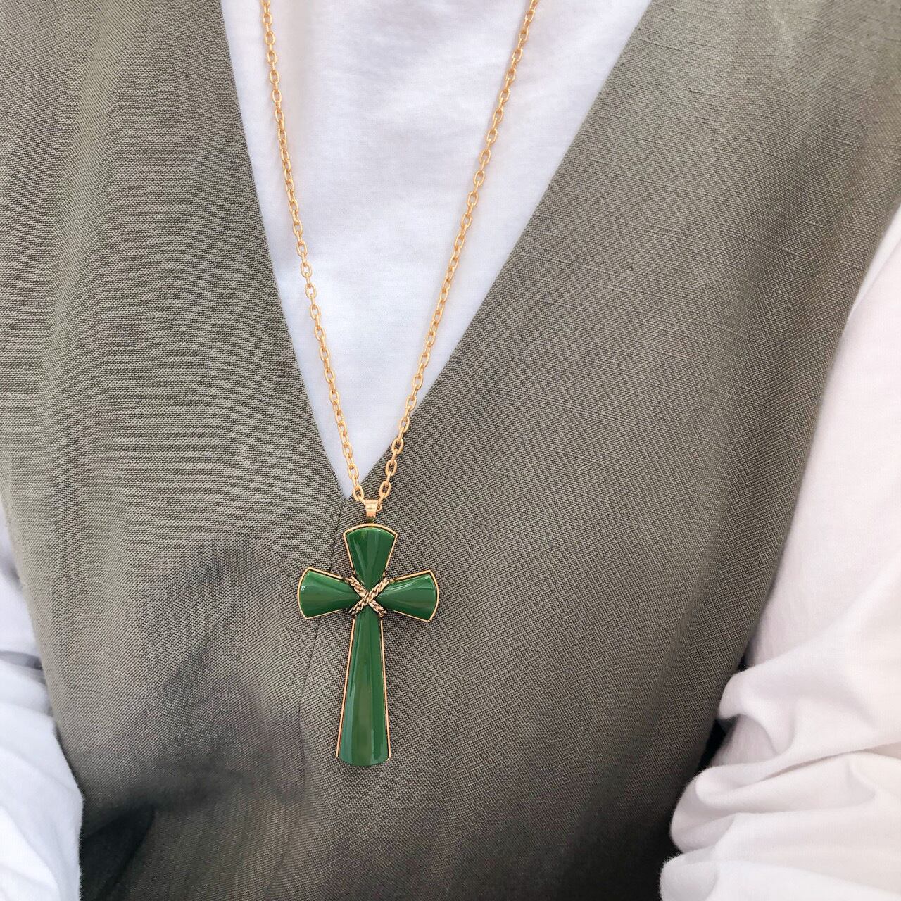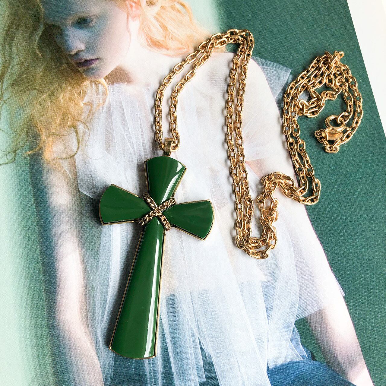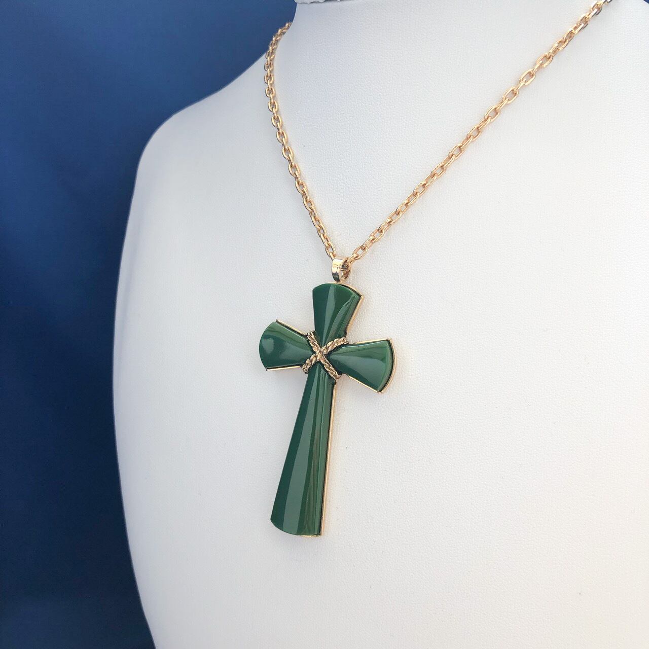 ゴールドメタルの土台に落ち着いたグリーンの十字架・クロスのデザインが、とても素敵な”AVON”(エイボン)のヴィンテージネックレスです。