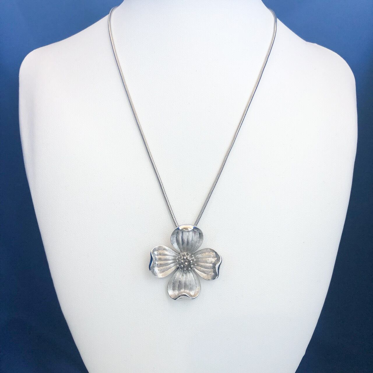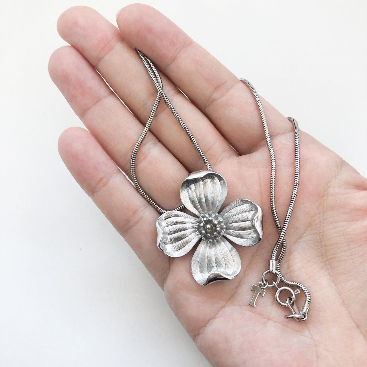 1910年に設立され、ハリウッドやブロードウェイのジュエリーも制作していたジュエリーメーカー"Trifari"(トリファリ)の、シルバーメタルのドッグウッド(ハナミズキ)のデザインが、とても素敵なヴィンテージネックレスです。