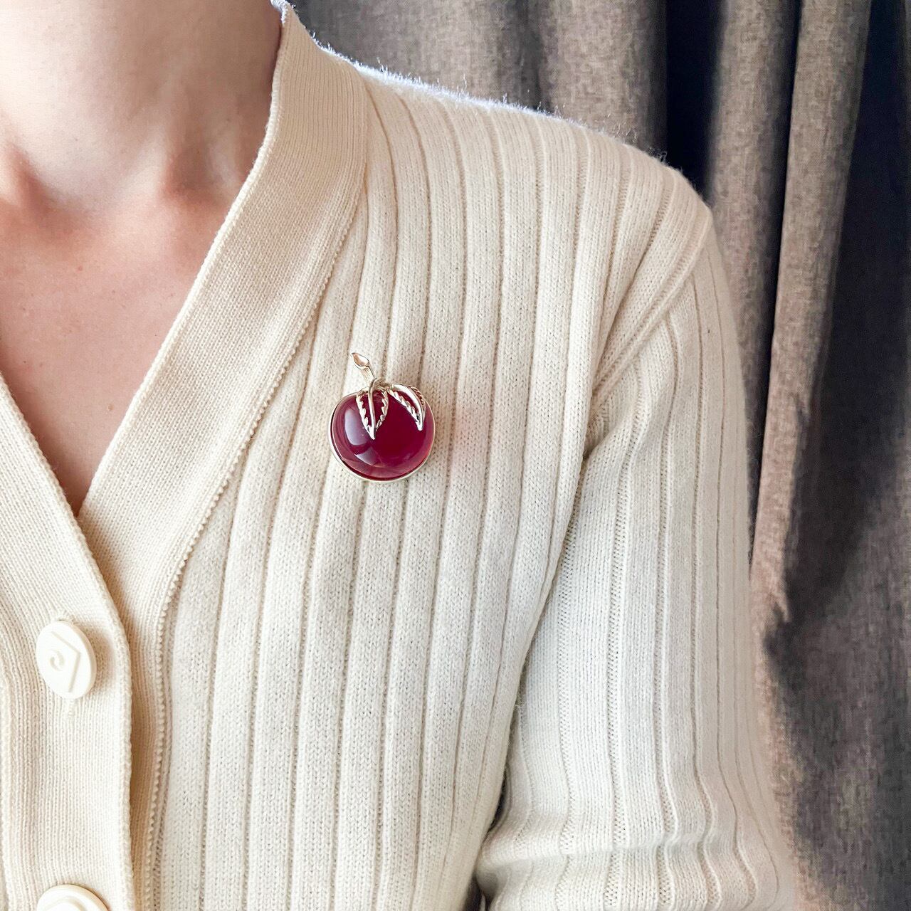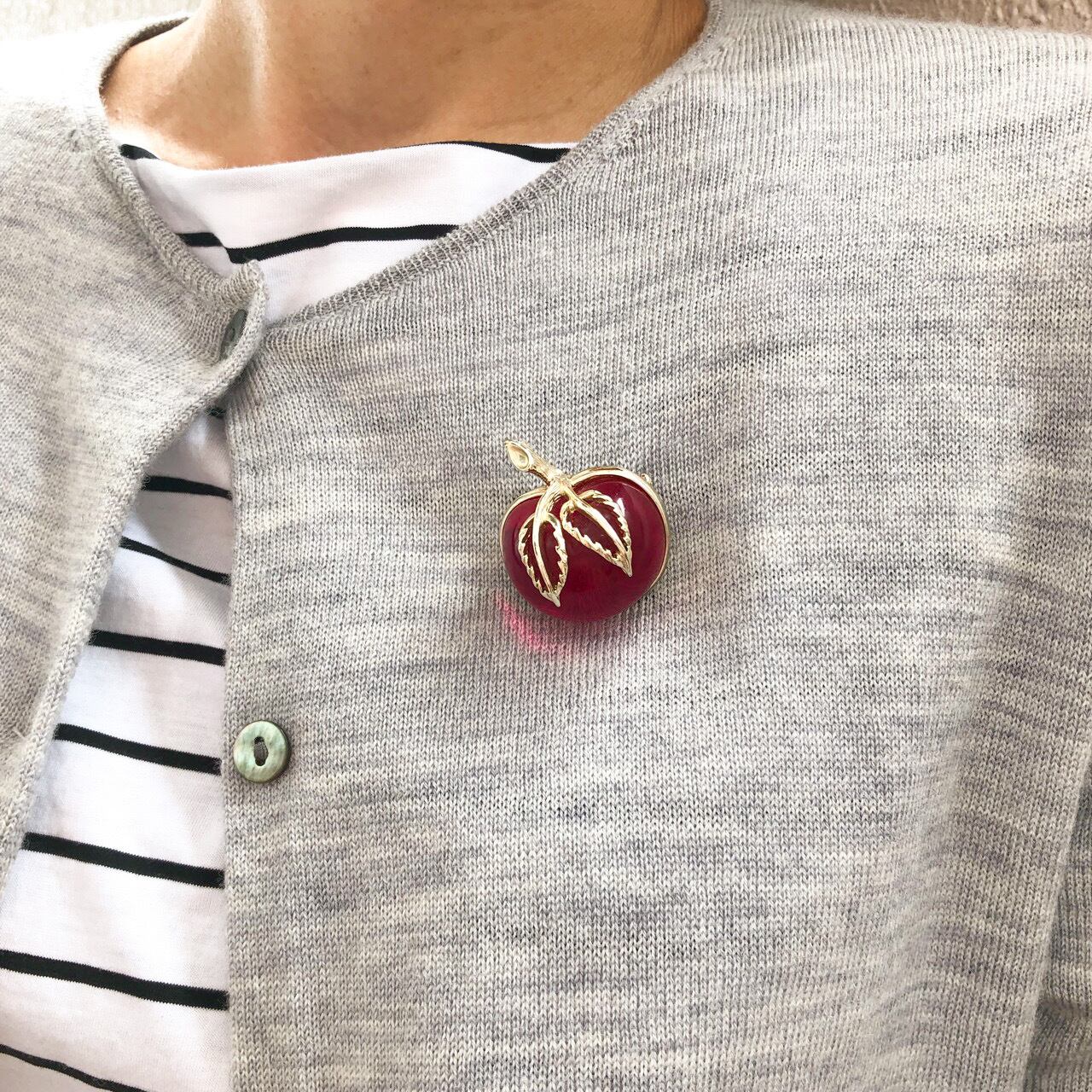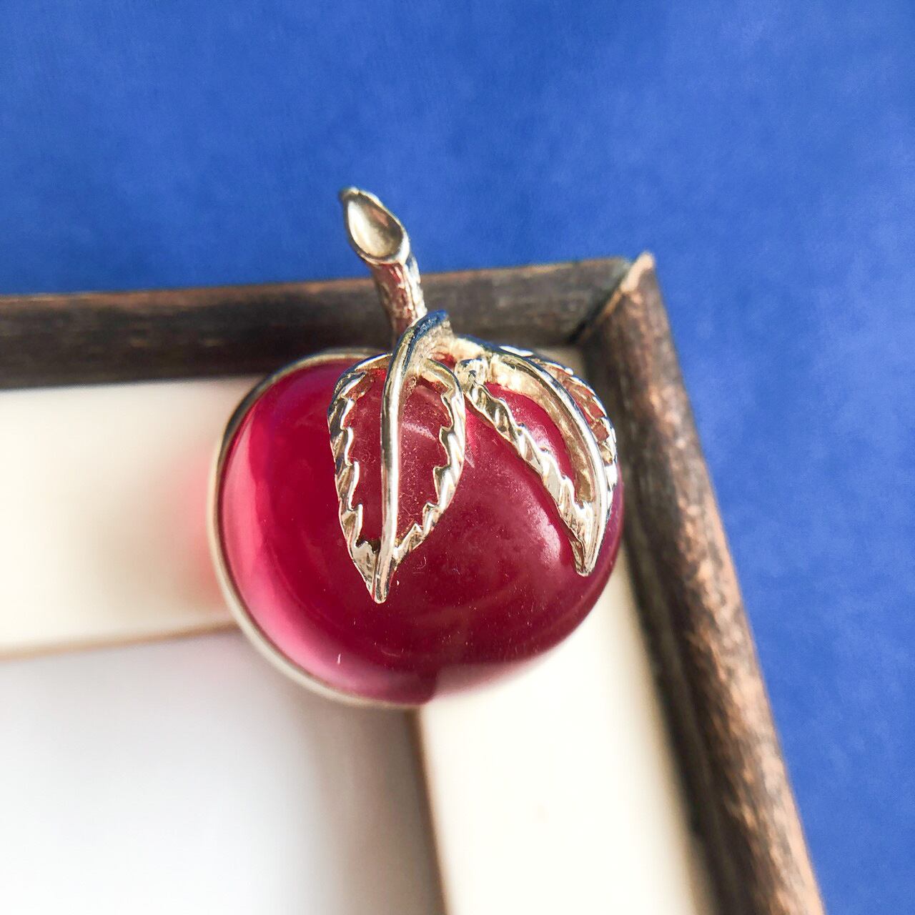 1949年に設立されたジュエリーメーカー”Sarah Coventry”(サラコベントリー )の、濃いピンク色のクリアルーサイトでぷっくりとデザインされたとても可愛い林檎のブローチです。