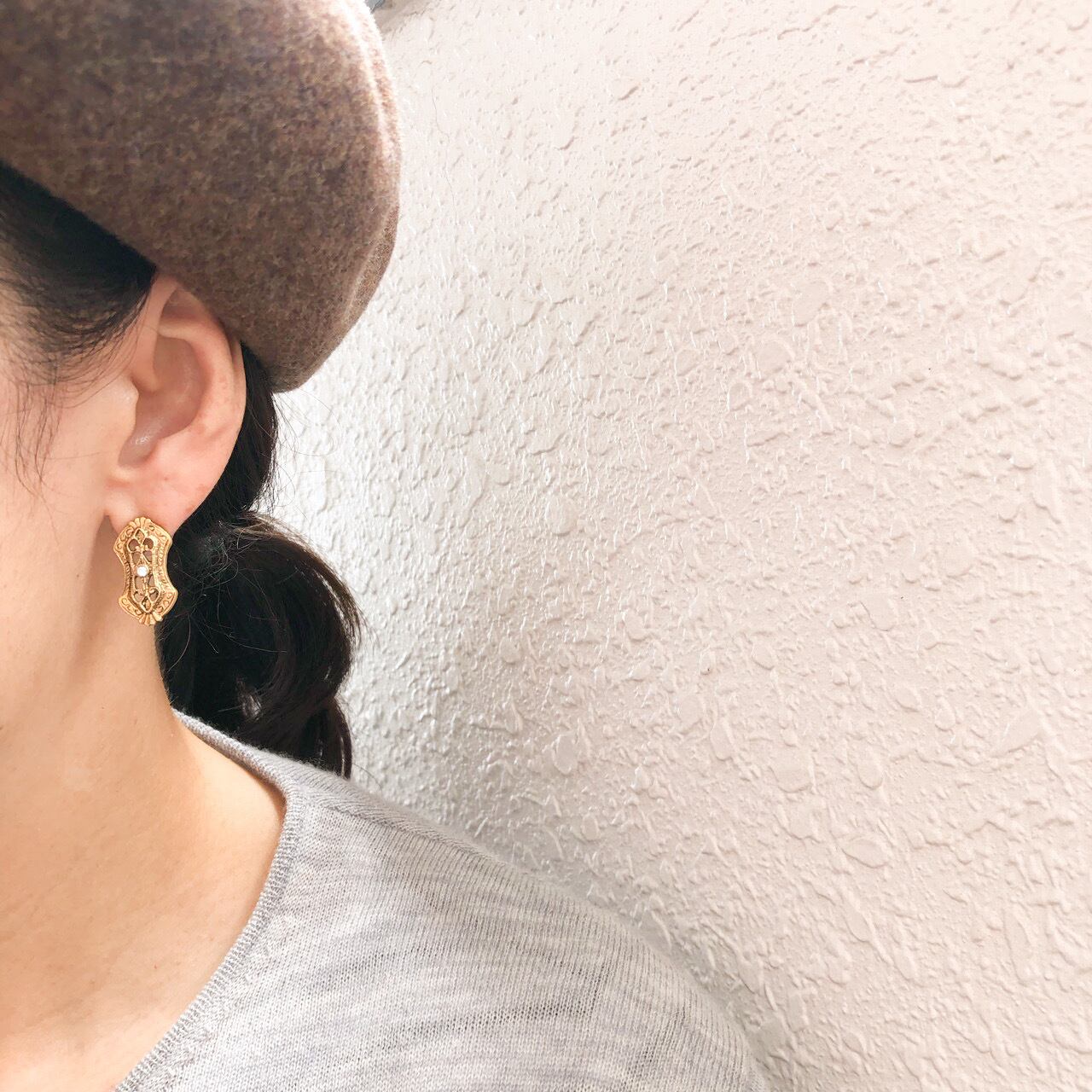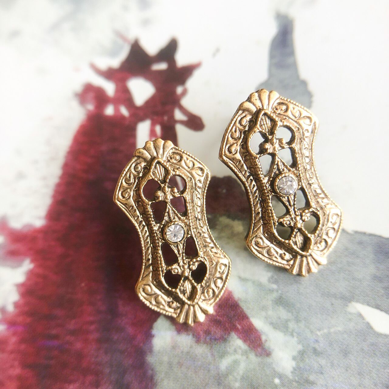 1968年に設立され、ヴィクトリアン調のデザインが特徴的なジュエリーメーカー"1928"の、ゴールドメタルの装飾的な土台に、小粒のクリアラインストーンがアクセントになった、とても素敵なヴィンテージピアスです。