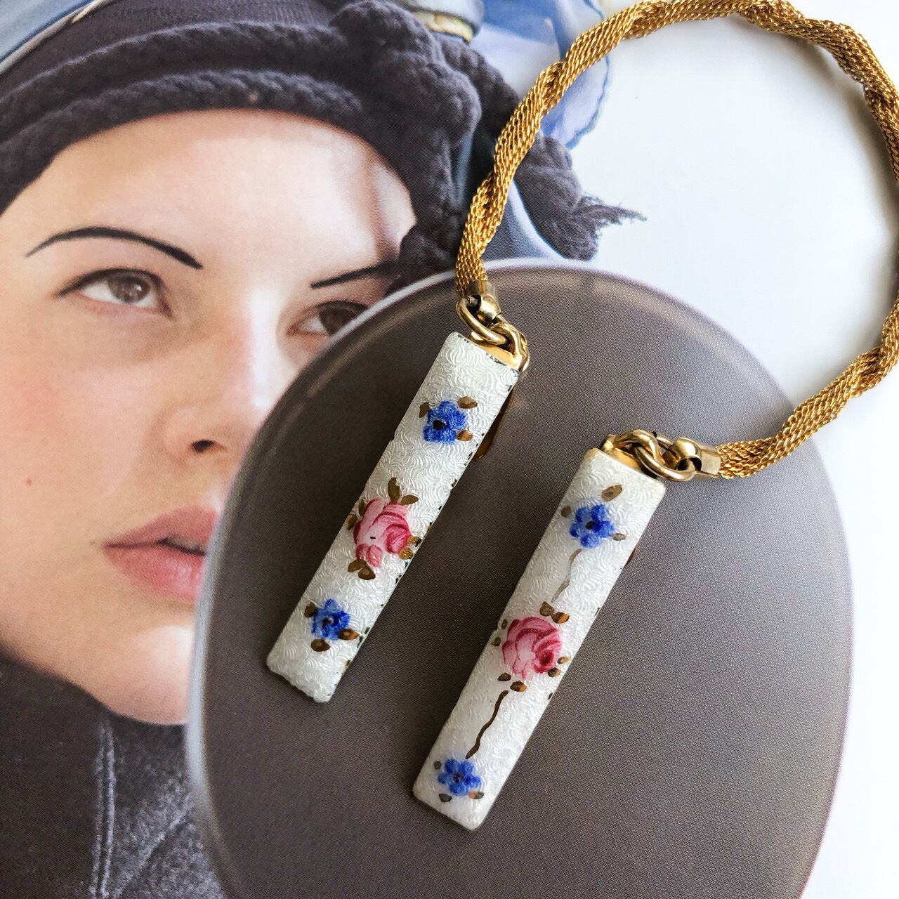 Guillocheという手法の、細やかな柄が入ったゴールドメタルの上にホワイトエナメルとハンドペイントの上品なお花のデザインが、とても素敵なヴィンテージのセータークリップです。