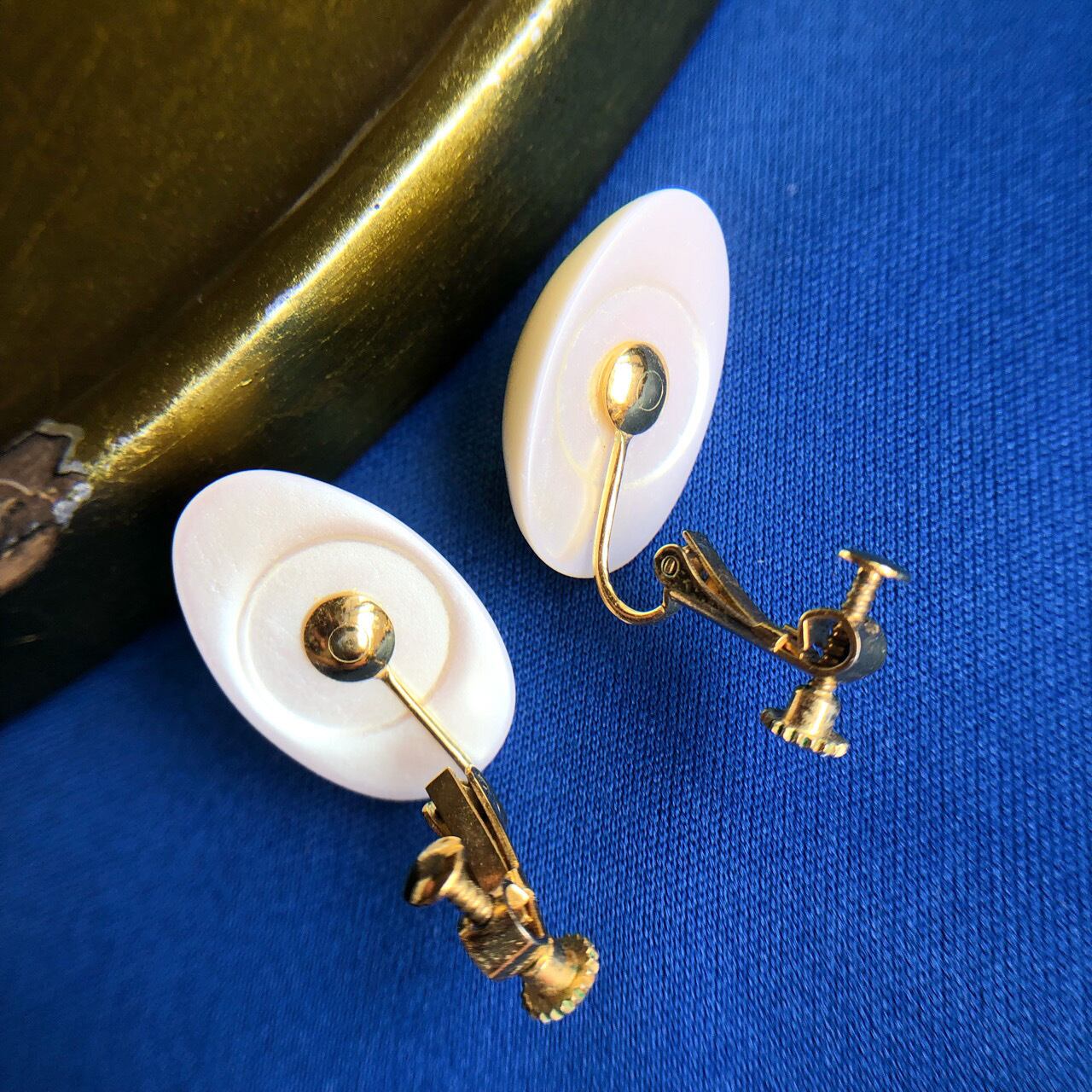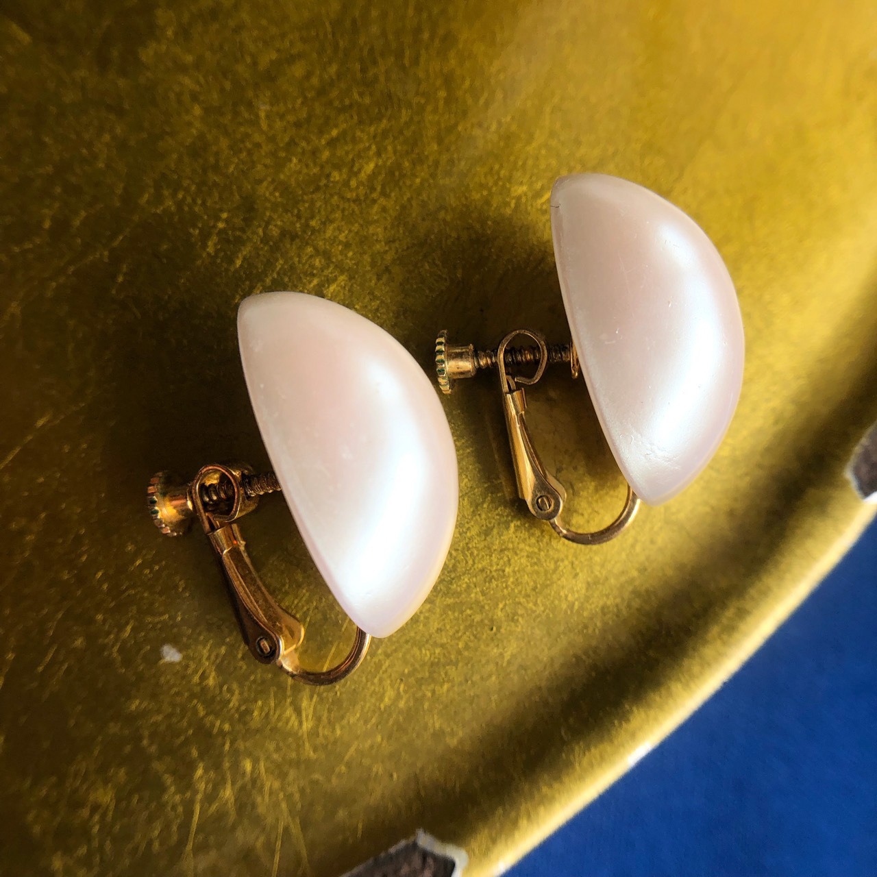 立体的なフォルムのオーバル型パールカボションが、シンプルながら存在感のある、とても素敵なヴィンテージイヤリングです。