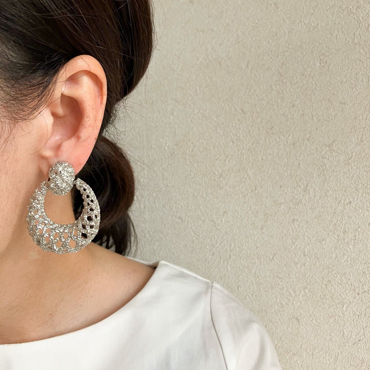 加工されたシルバーメタルの透かし柄が華やかな大きめサークルデザインが、とても素敵なヴィンテージイヤリングです。