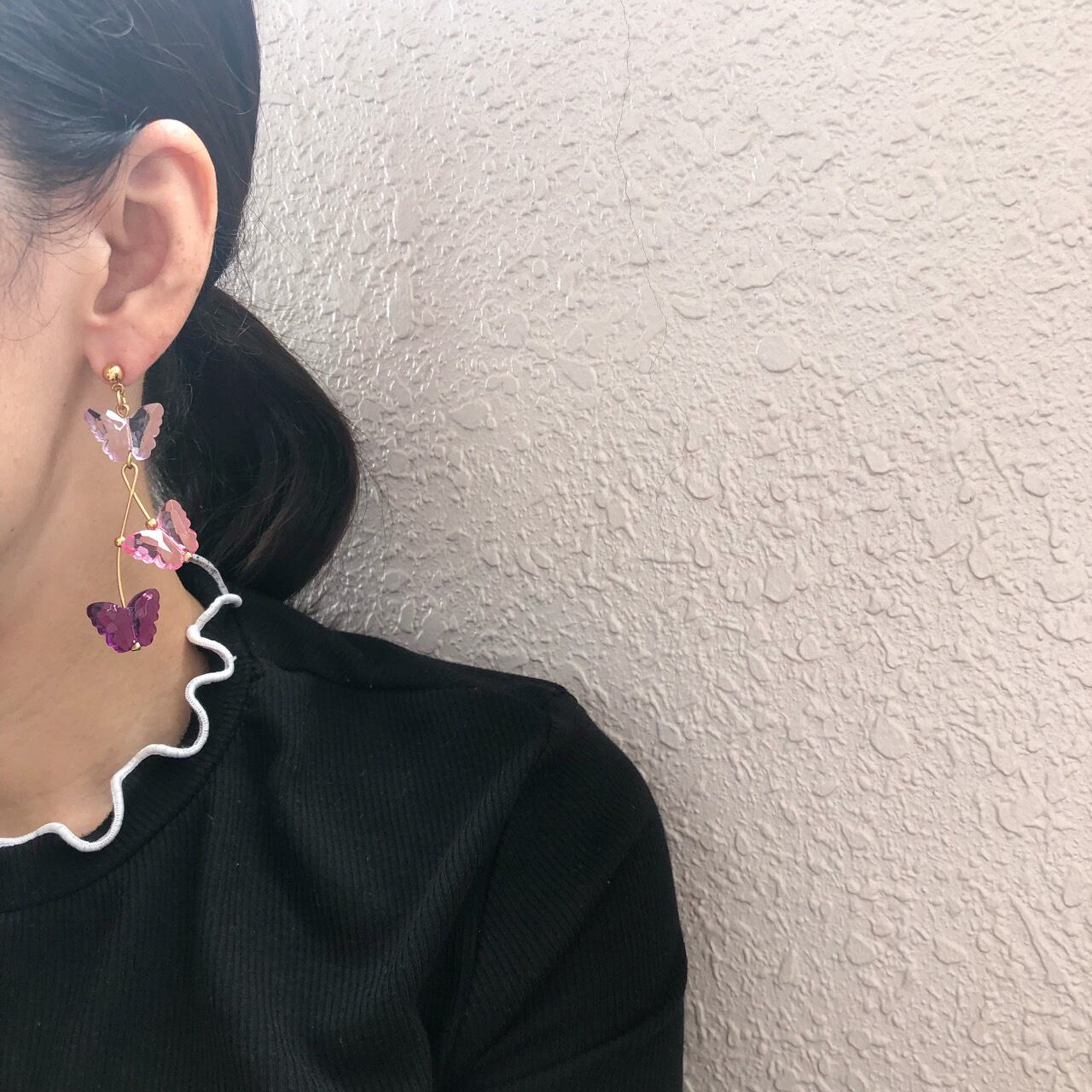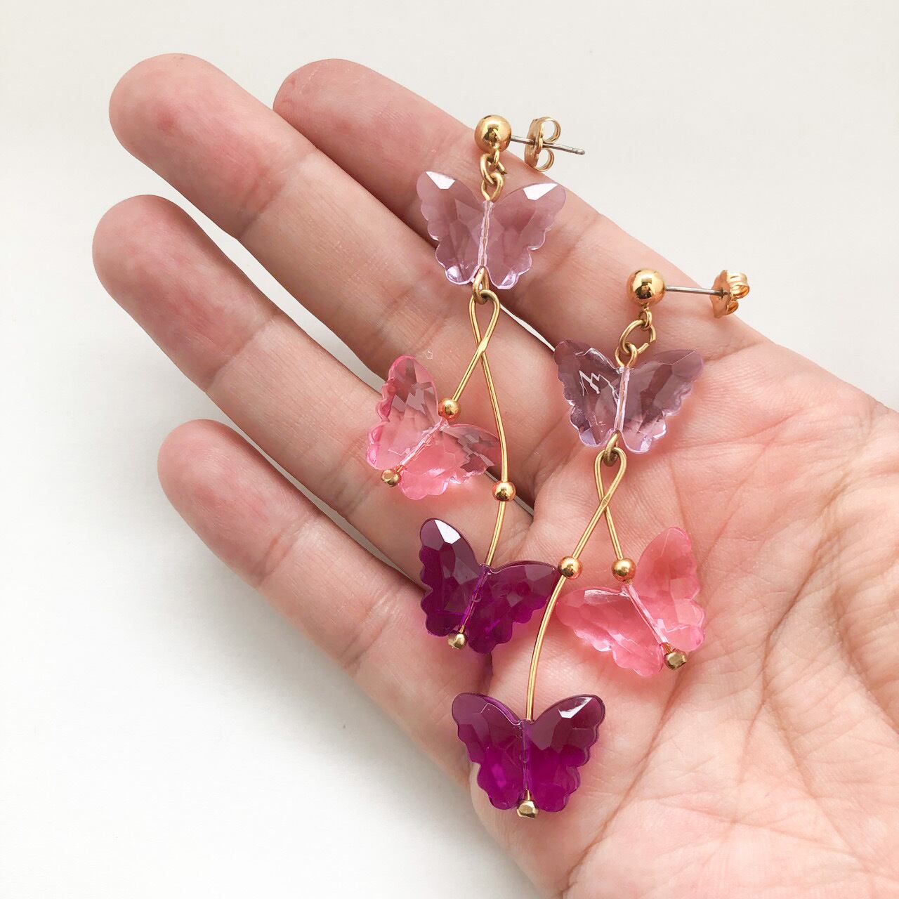 ゴールドメタルのワイヤーに、パープル&ピンク系のクリアプラスティックの蝶々パーツが揺れる、とても素敵な”AVON”(エイボン)のヴィンテージピアスです。