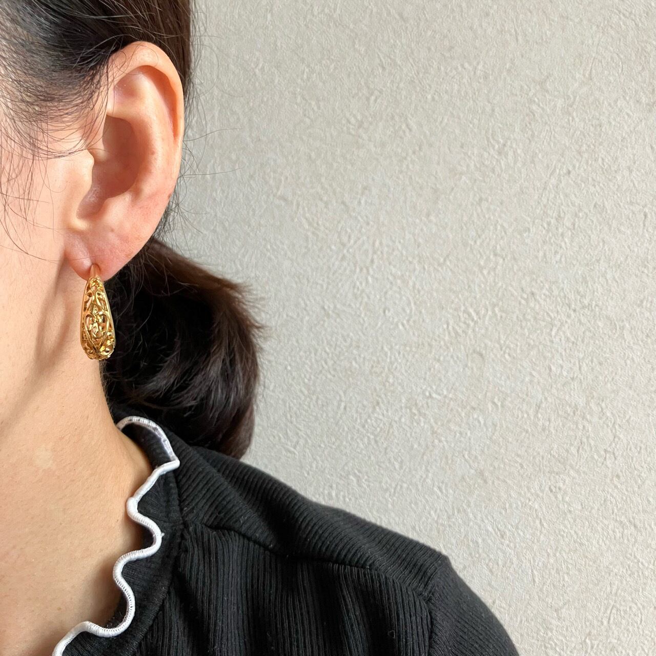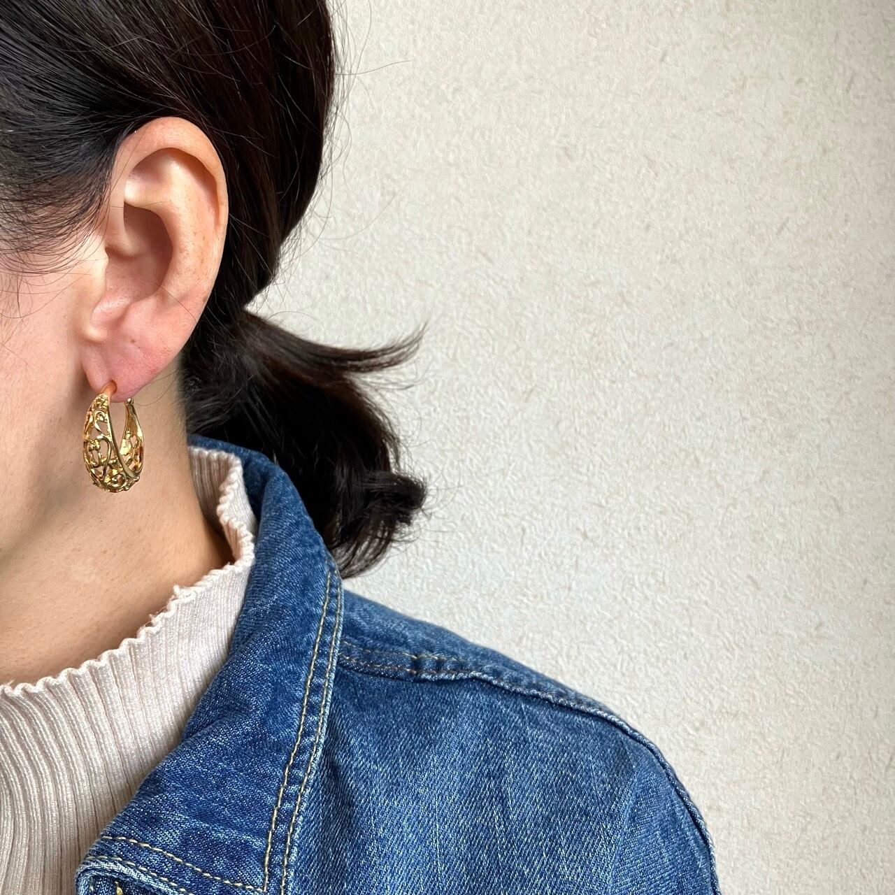 ゴールドメタルの美しい透かし柄のフープデザインが、とても素敵なヴィンテージピアスです。
