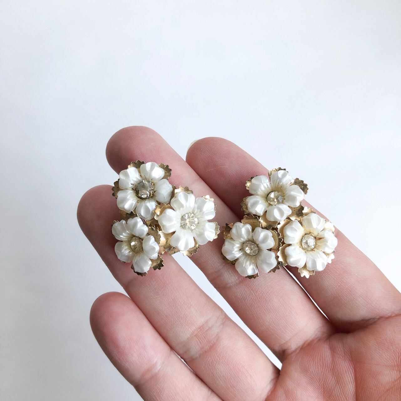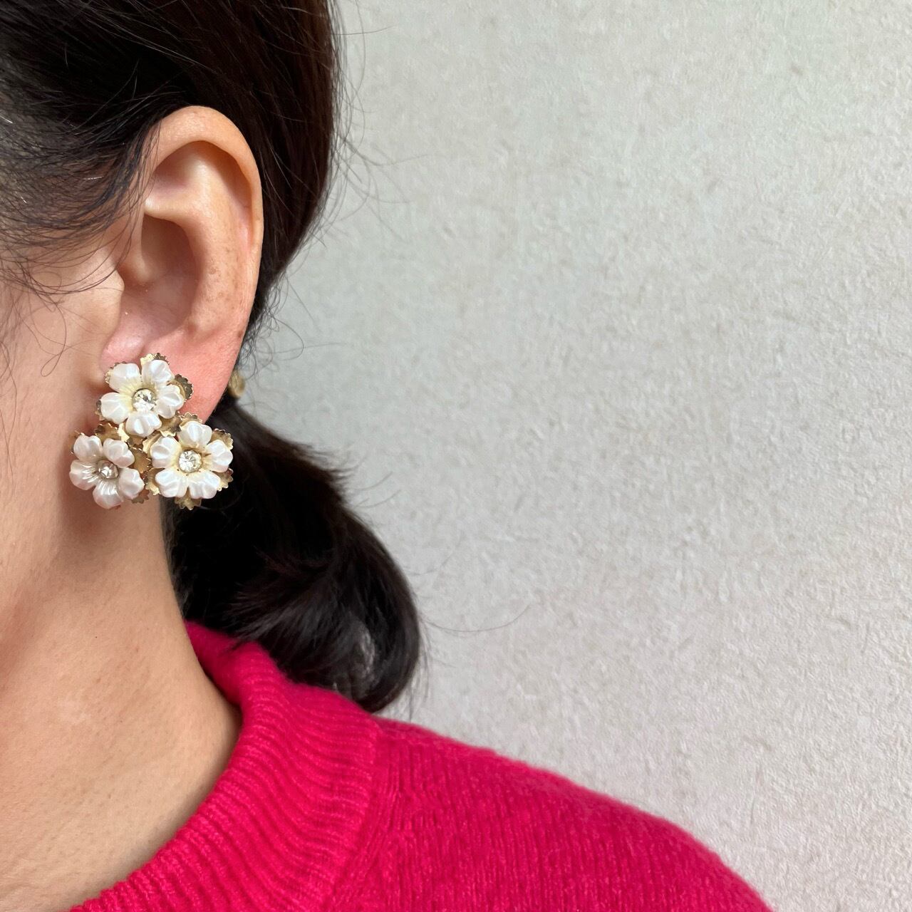ゴールドメタルの土台に、パール感のある花びらとクリアラインストーンの上品なお花が3つ集まったデザインが、とても素敵なヴィンテージイヤリングです。