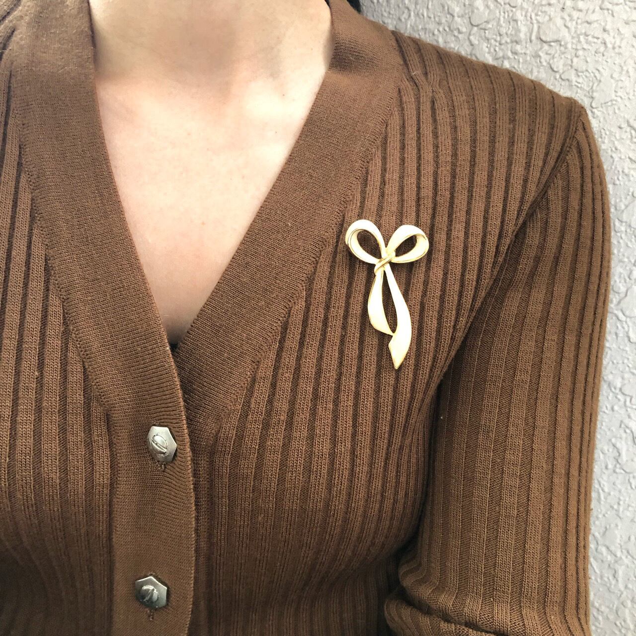 ゴールドメタルの土台にクリームエナメルで、動きのあるお洒落なリボンがデザインされた、とても素敵な”AVON”(エイボン)のヴィンテージブローチ&ピアスです。