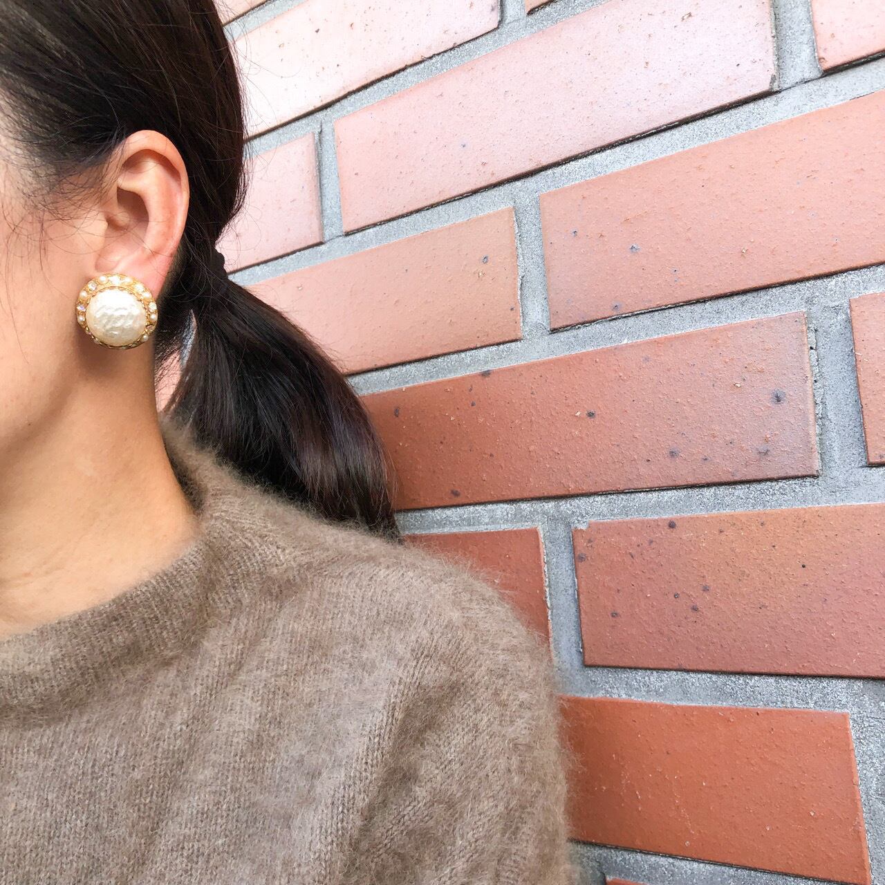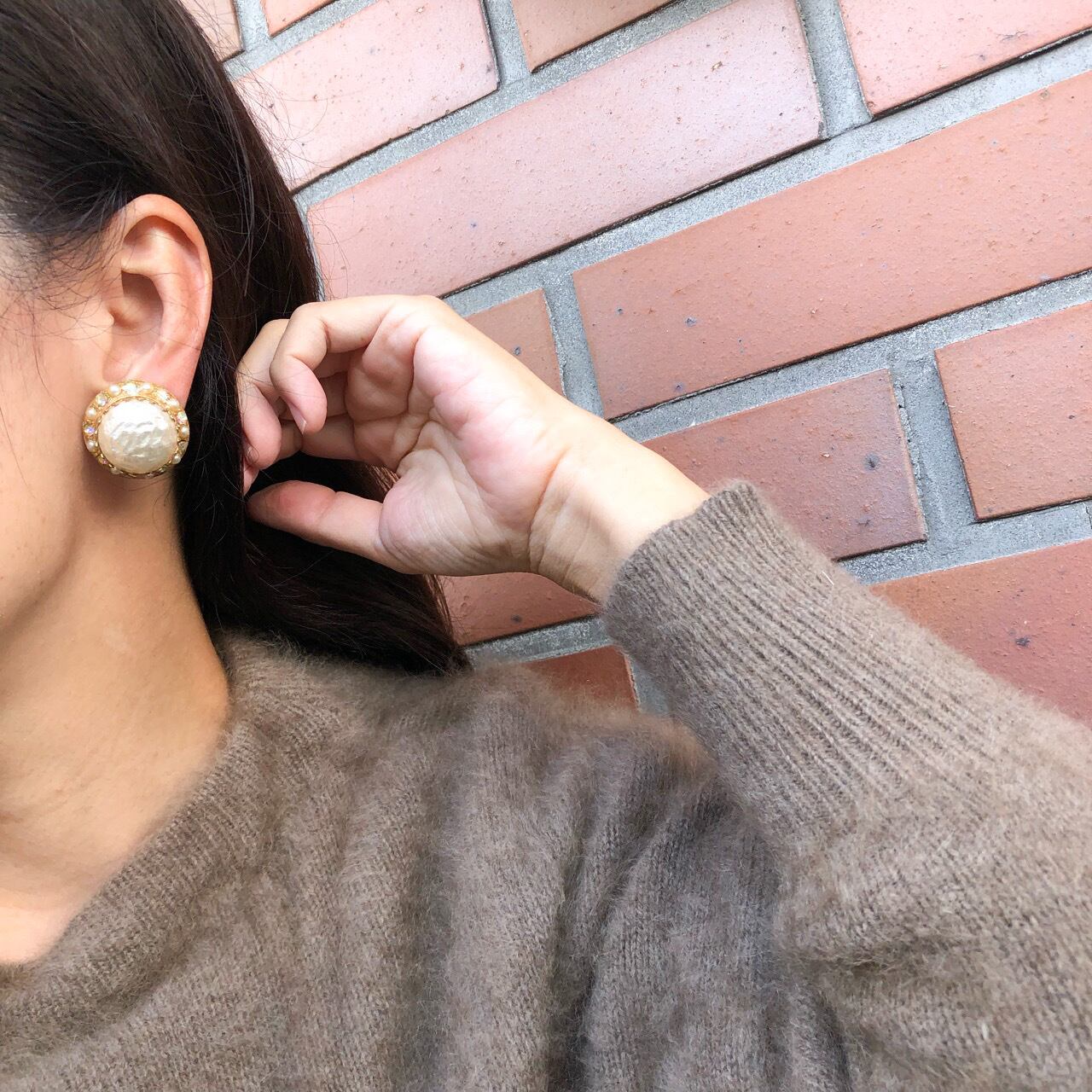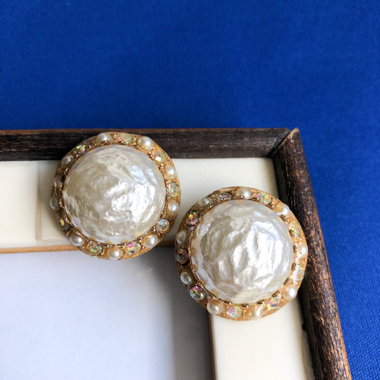 大粒のバロックパールカボションが縦爪に立体的にセットされ、周りをオーロララインストーンとパールビーズで飾られた、ヴィンテージらしいクラシカルで華やかなデザインがとても素敵なヴィンテージイヤリングです。