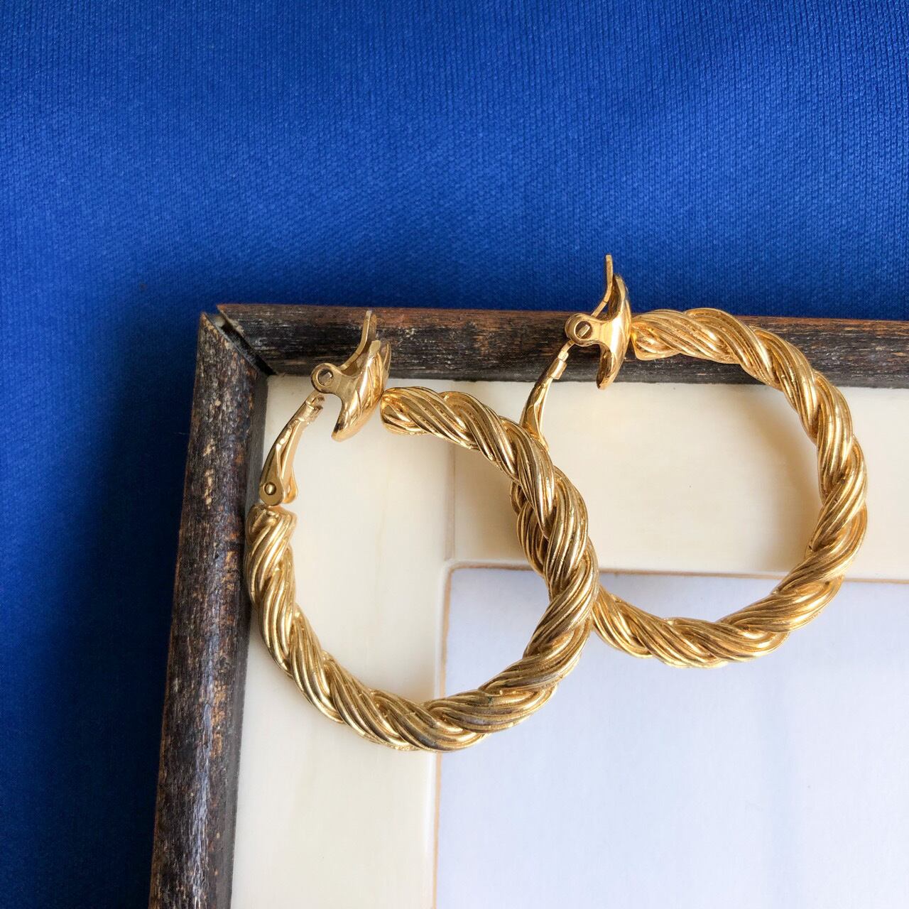 1910年に設立され、ハリウッドやブロードウェイのジュエリーも制作していた人気のジュエリーメーカー"Trifari"(トリファリ)の、ゴールドメタルのロープのようなフープのデザインがシンプルで洗練されたとても素敵なヴィンテージイヤリングです。