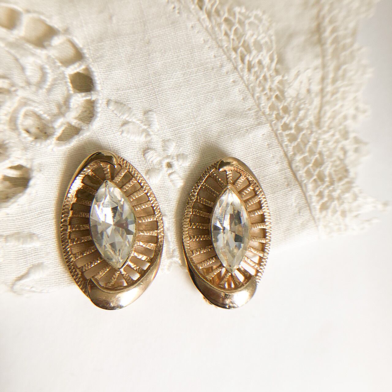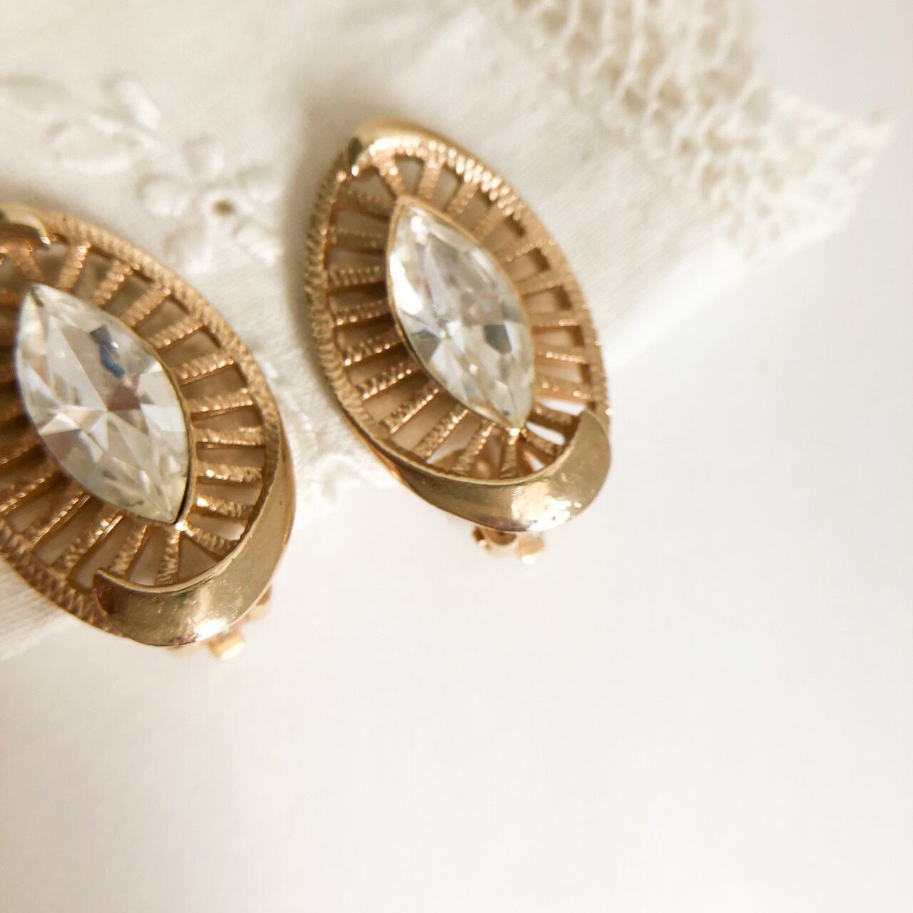 ゴールドメタルの装飾的な土台に、美しいクリアラインストーンでデザインされた、とても素敵なヴィンテージイヤリングです。