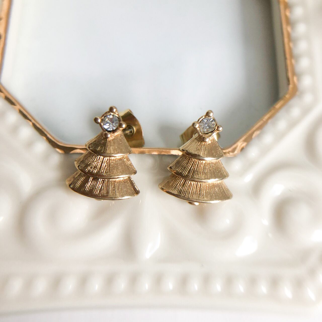 落ち着いたゴールドメタルに小粒のクリアラインストーンでシンプルで洗練されたお洒落なクリスマスツリーがデザインされた、とても素敵な”AVON”(エイボン)のヴィンテージピアスです。
