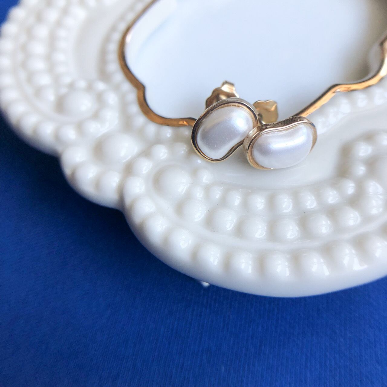 ゴールドメタルの土台にビーンズ型のパールカボションの上品なデザインが、とても素敵な”AVON”(エイボン)のヴィンテージピアスです。