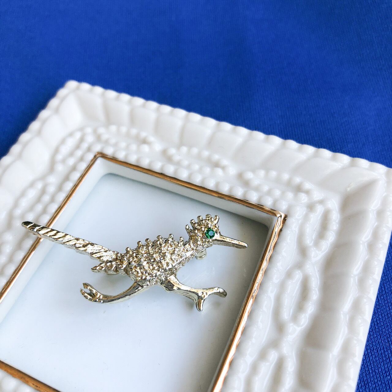 明るいゴールドメタルにグリーンラインストーンの目がアクセントになった、ロードランナーのデザインがとてもユニークで素敵なヴィンテージブローチです。