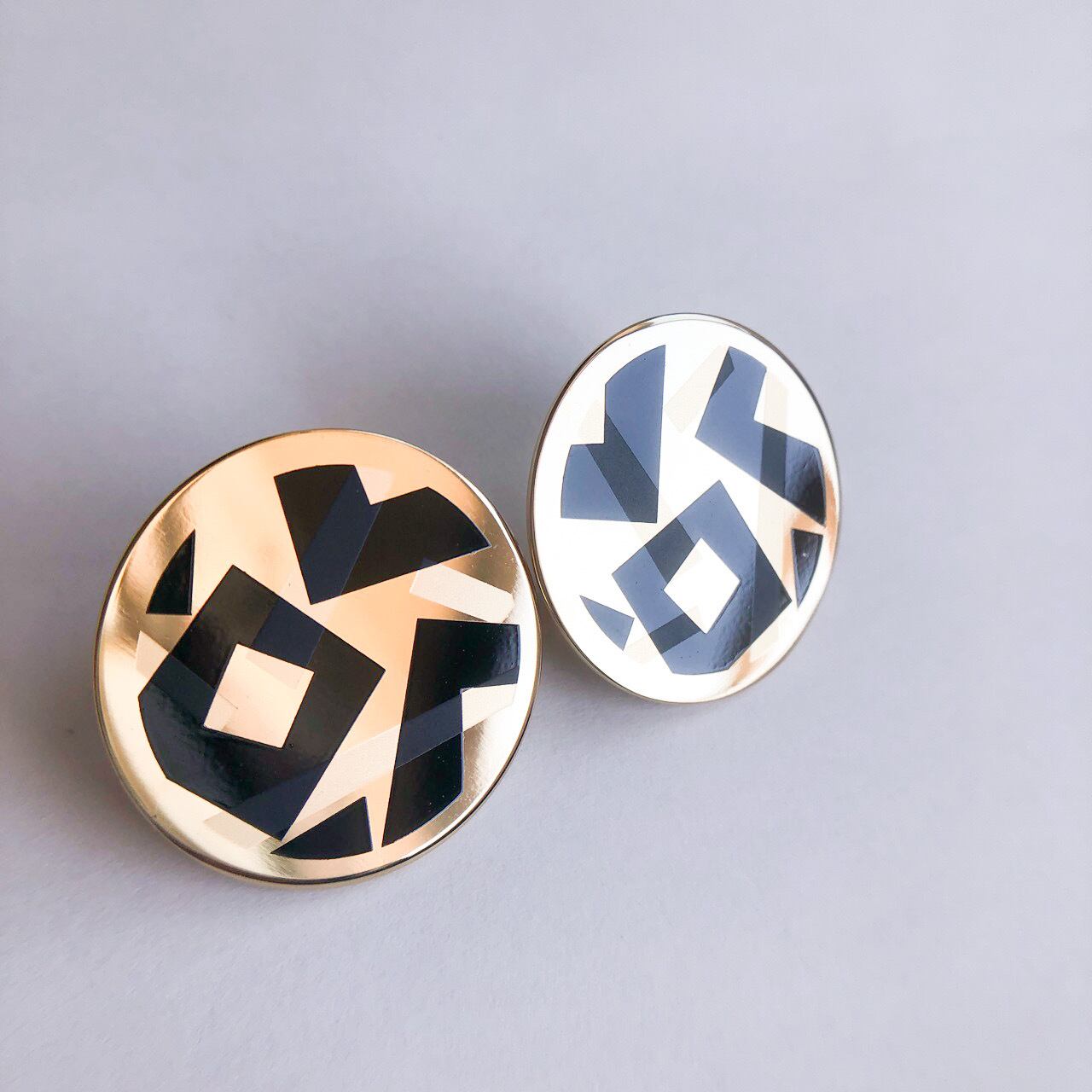 ゴールドメタルの薄いプレートにブラックと薄いホワイト系の色合いでグラフィカルな柄がデザインされた、お洒落でとても素敵な”AVON”(エイボン)のヴィンテージイヤリングです。