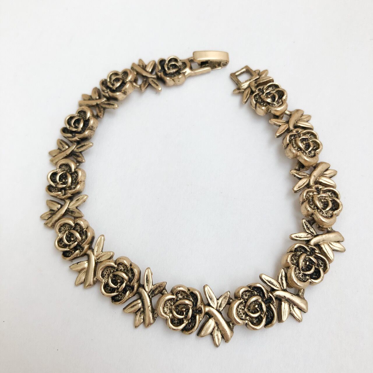 落ち着いたマット感のあるアンティーク調ゴールドメタルの薔薇が連なったようなデザインが、とても素敵なヴィンテージブレスレットです。