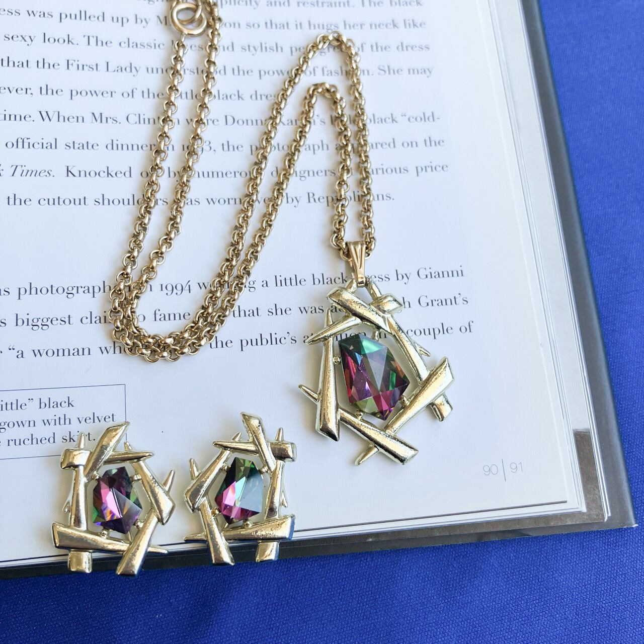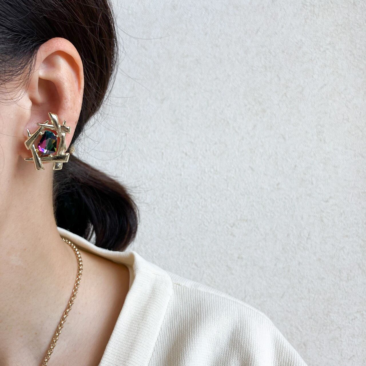 1949年に設立されたジュエリーメーカー”Sarah Coventry”(サラコベントリー )の、ゴールドメタルにウォーターメロンラインストーンのヴィンテージらしいモダンなデザインが素敵なイヤリングです。
