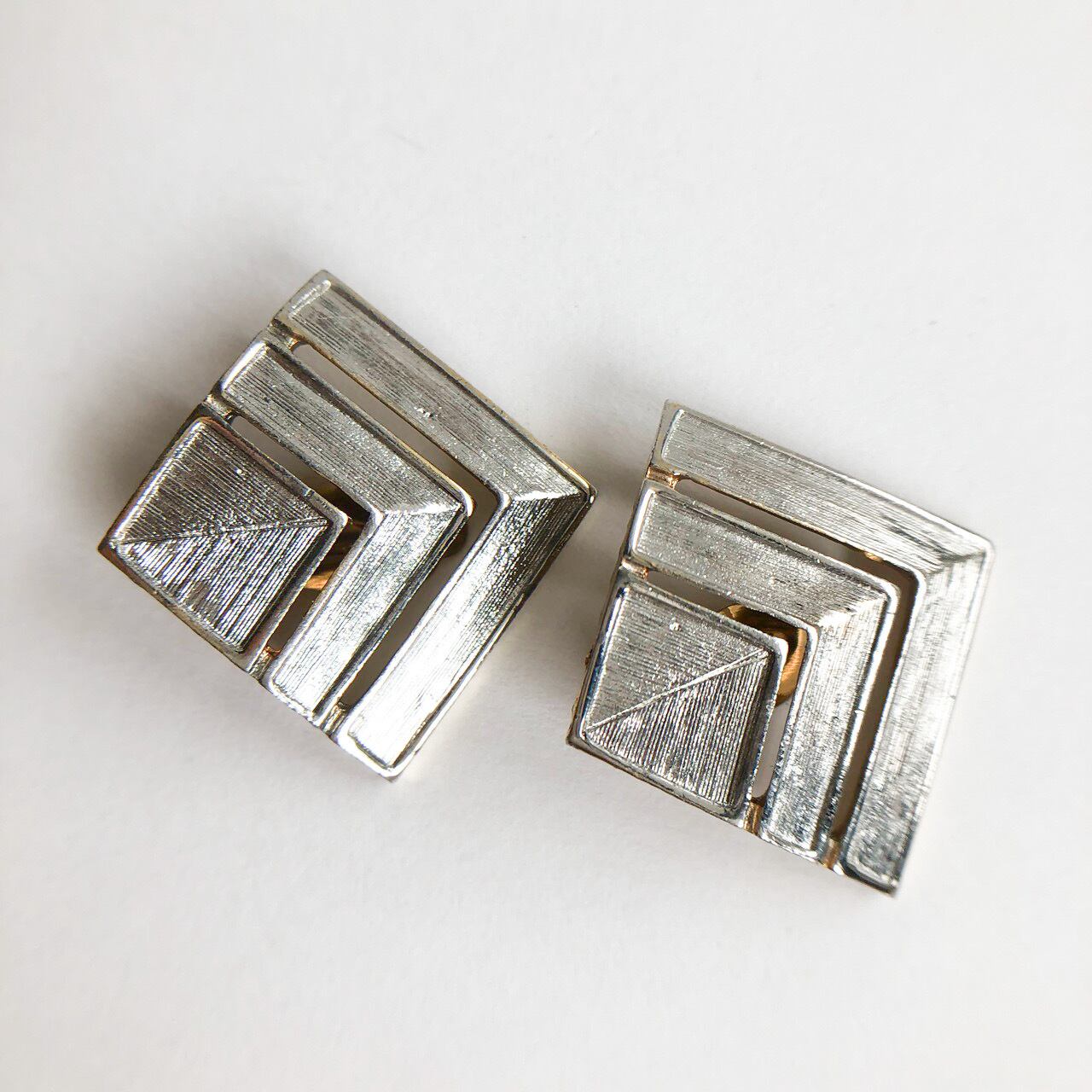 加工されたシルバーメタルのシャープでモダンなデザインが、とてもお洒落で素敵なヴィンテージイヤリングです。