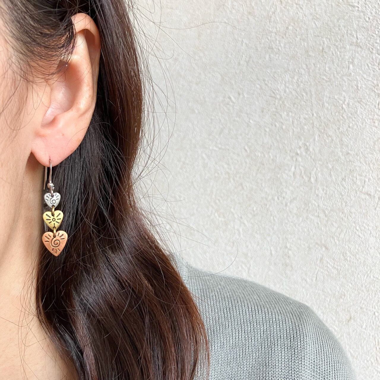 落ち着いたシルバー、ゴールド、ブロンズのメタルハートが揺れる、とても素敵な”AVON”(エイボン)のヴィンテージピアスです。