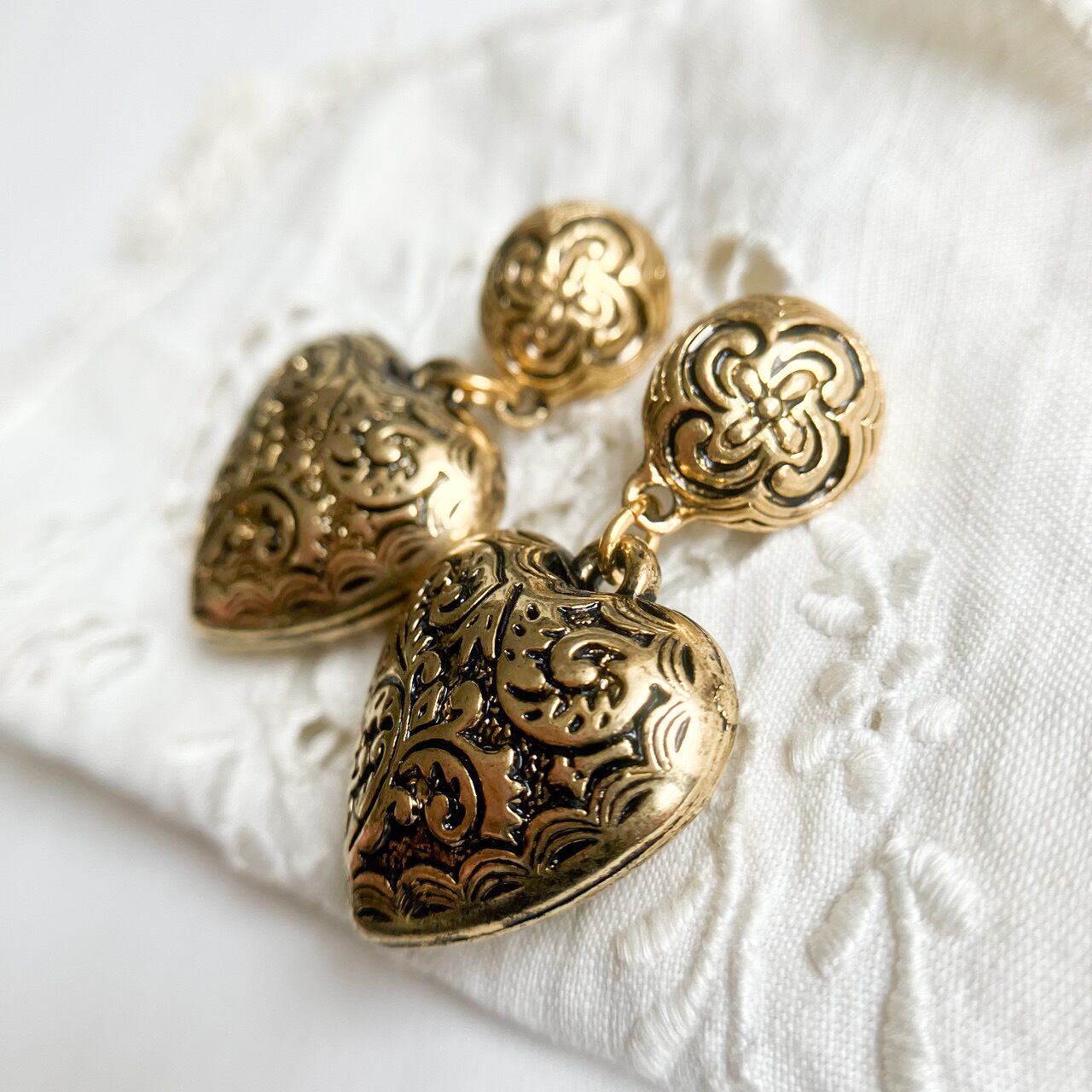 ゴールドメタルに華やかな装飾柄が入った立体的なハートモチーフが揺れる、ヴィンテージらしいデザインがとても素敵な”AVON”(エイボン)のヴィンテージピアスです。