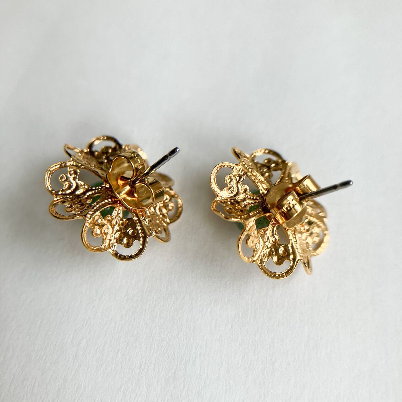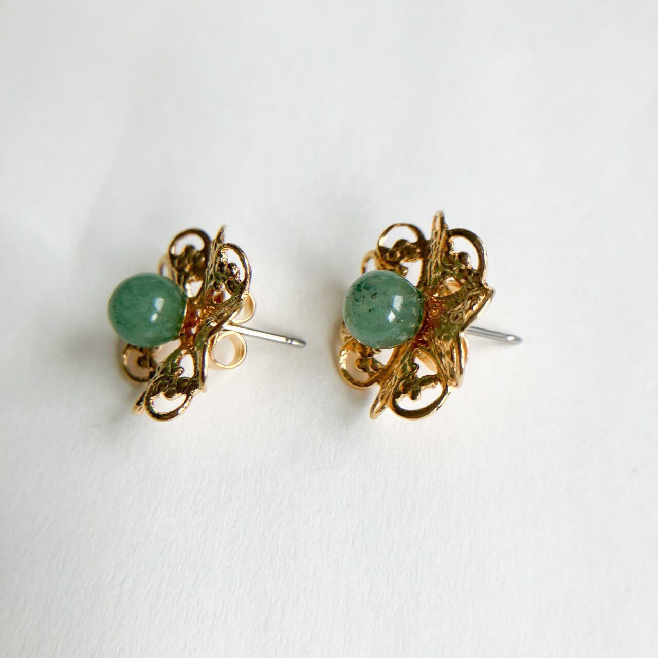 ゴールドメタルの装飾的な透かしパーツと、落ち着いた優しいグリーンのアベンチュリンパーツが組み合わされた、上品なフラワーデザインがとても素敵な”AVON”(エイボン)のヴィンテージピアスです。