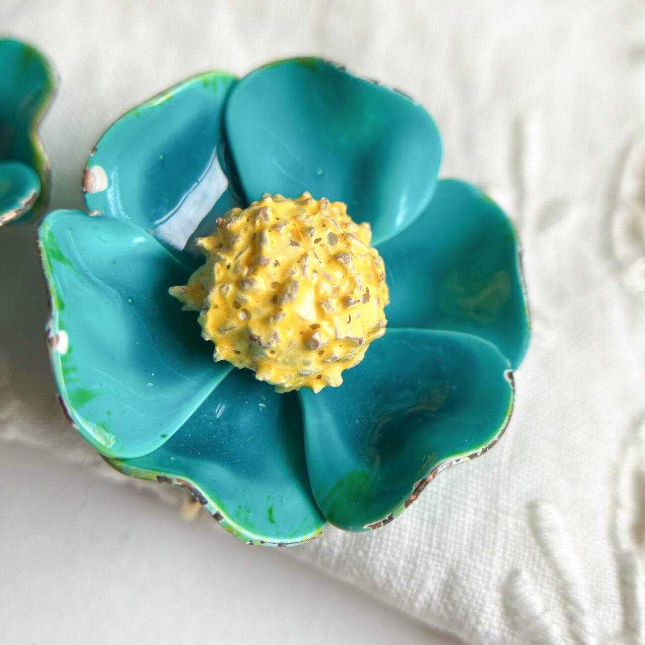 落ち着いたブルーグリーンとイエローエナメルの60年代らしいレトロなフラワーデザインが、とても素敵なヴィンテージピアスです。