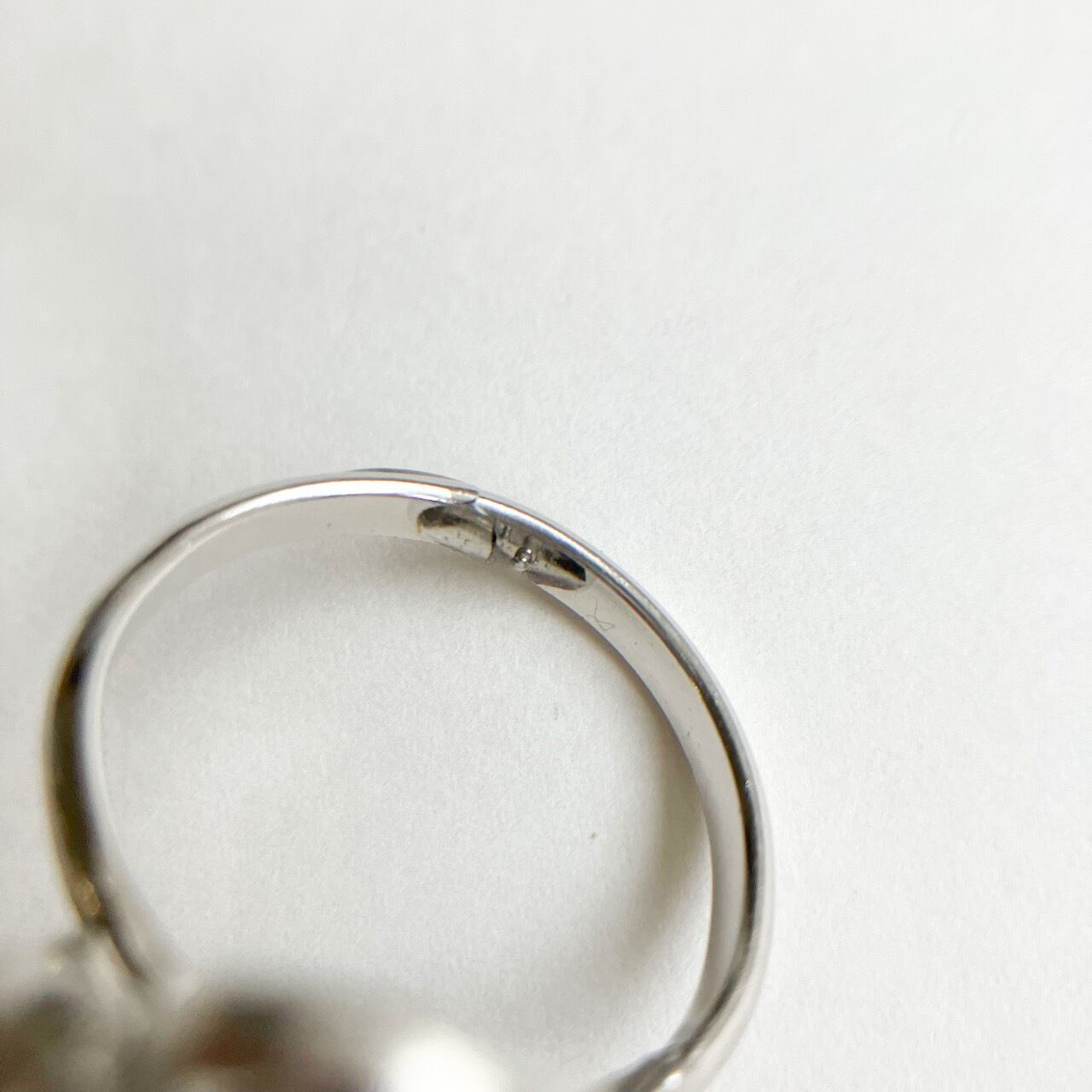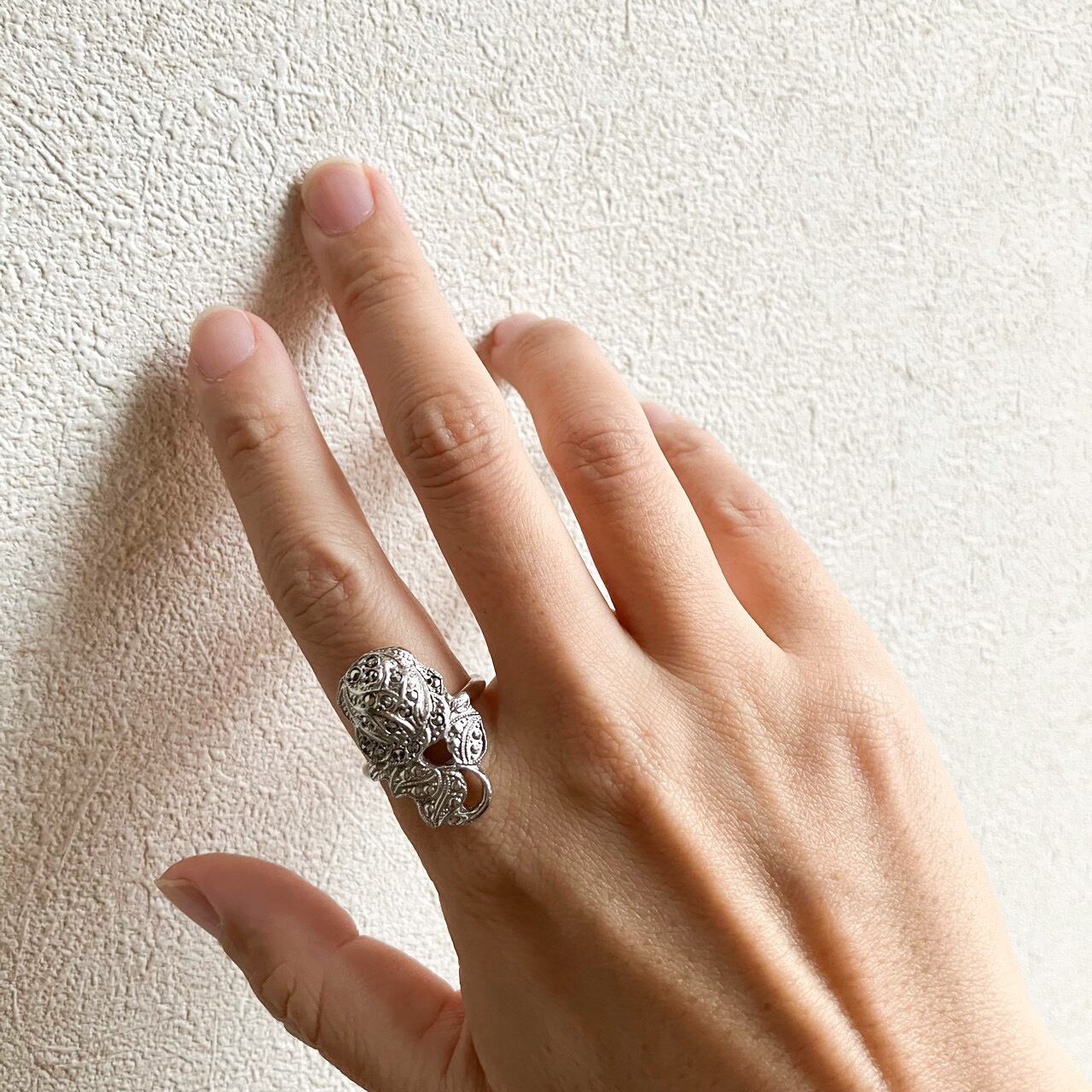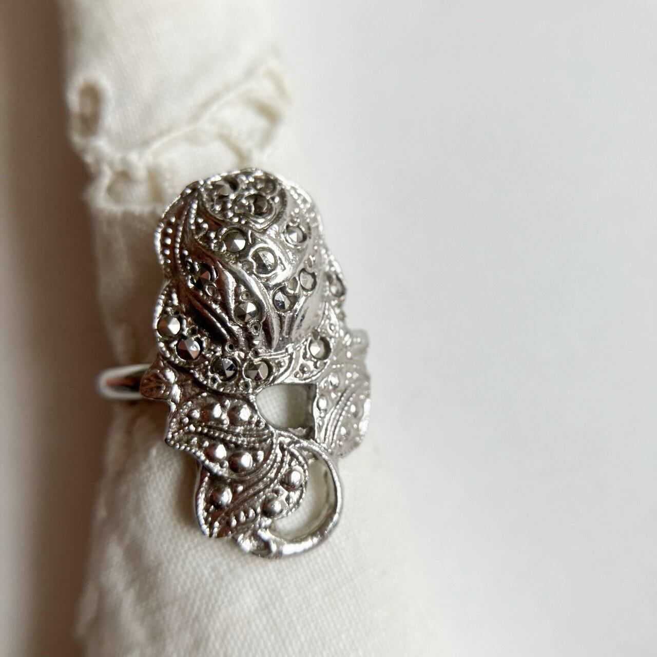 マーカサイト風パーツがさりげないアクセントになったシルバーメタルの美しい薔薇のデザインが、とても素敵なヴィンテージリングです。