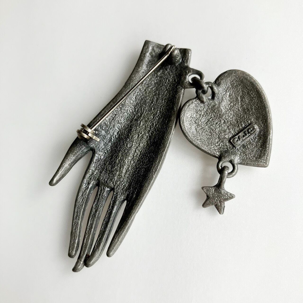 "AJC"のマットなシルバーメタルの、カップルと夜空がデザインされたハンドモチーフと、揺れるハート&スターが、とても素敵なヴィンテージブローチです。