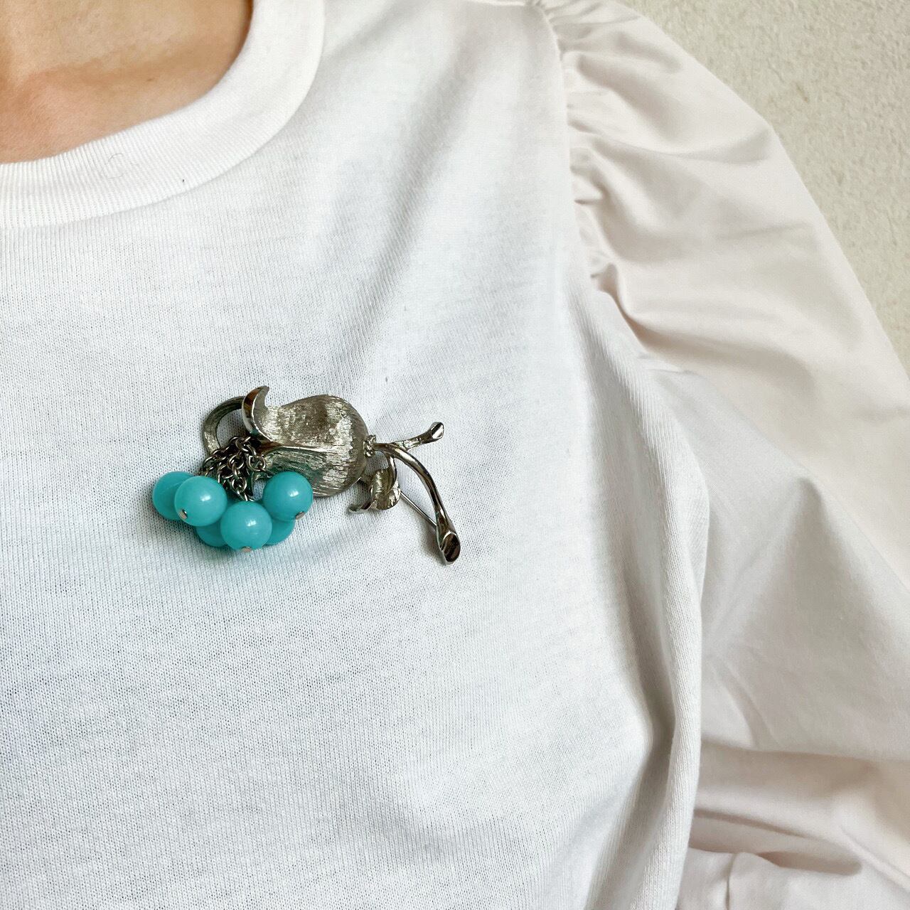 加工されたシルバーメタルに爽やかなライトブルーのビーズが揺れるお花がデザインされた、とても素敵なヴィンテージブローチです。